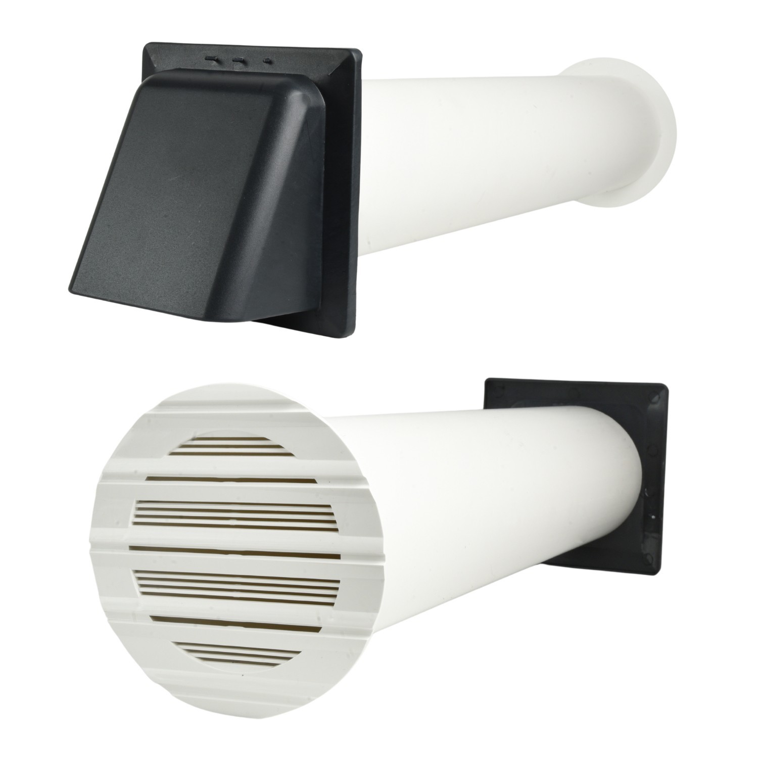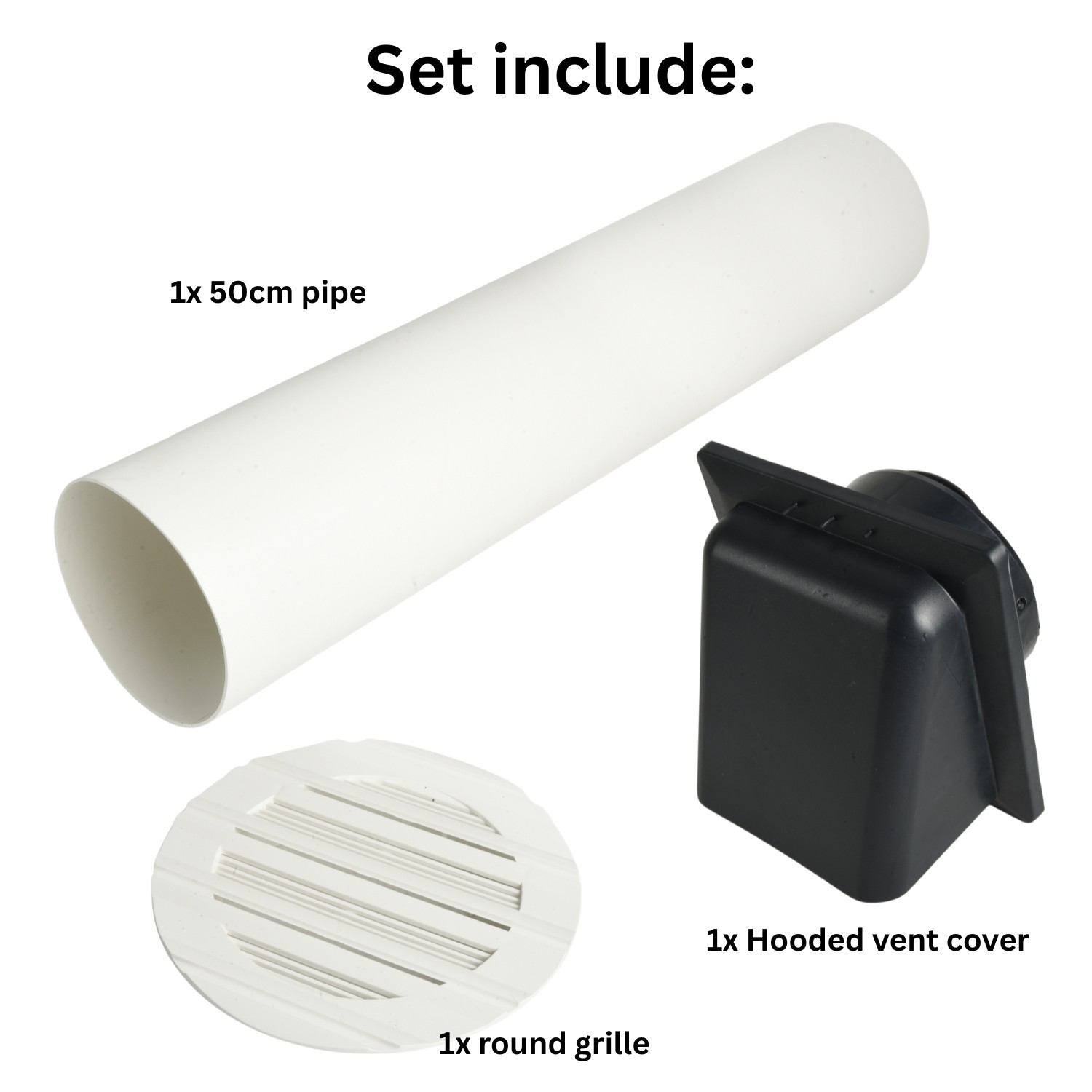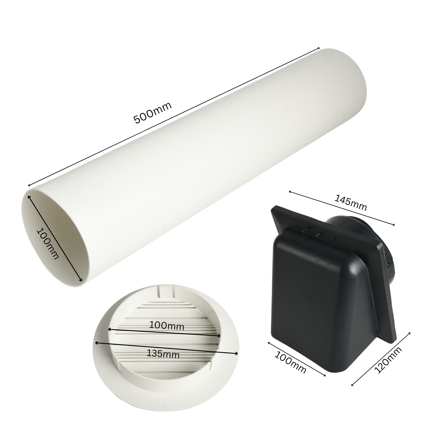 The kit combines a round internal louvre grille with a rigid duct section and a hooded external cover. Made from durable ABS and PVC components, it’s built to resist everyday wear and typical outdoor weather exposure when used as intended.