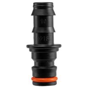 The barbed end pushes into 13mm internal diameter porous/drip hose for a secure hold, while the other end is shaped to accept a female quick-release fitting. Made from UV-stabilised materials, it’s designed for outdoor use and long service life.