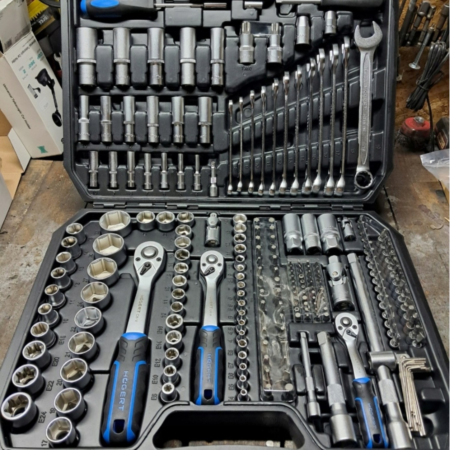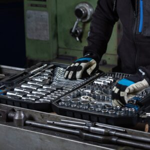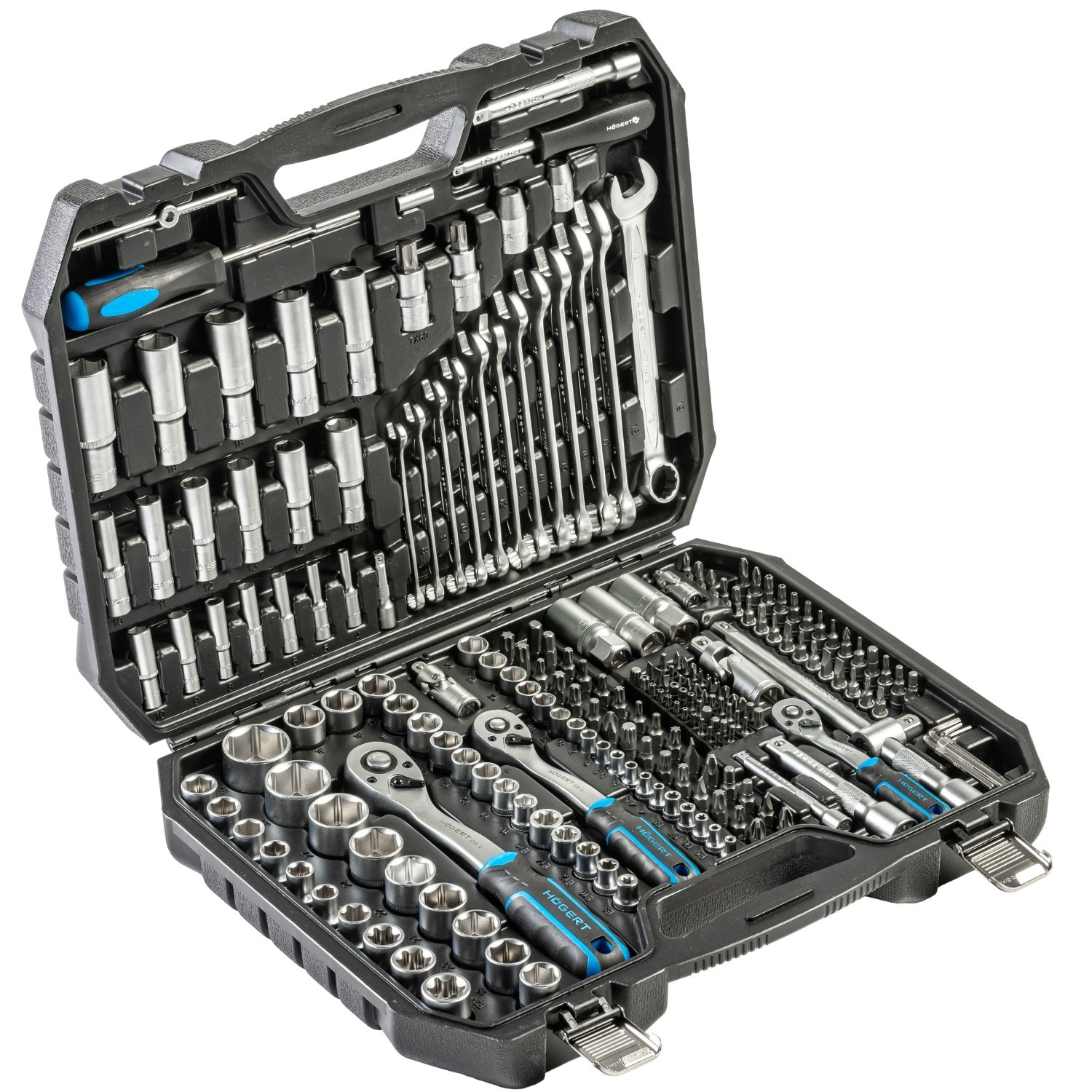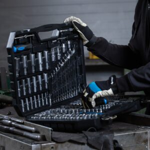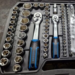 A comprehensive 222-piece socket, bit and accessory kit for professional and heavy-duty DIY use. Includes 1/4″, 3/8″ and 1/2″ drive ratchets with a wide mix of sockets, bits and spanners, all stored in a tough carry case for easy transport.