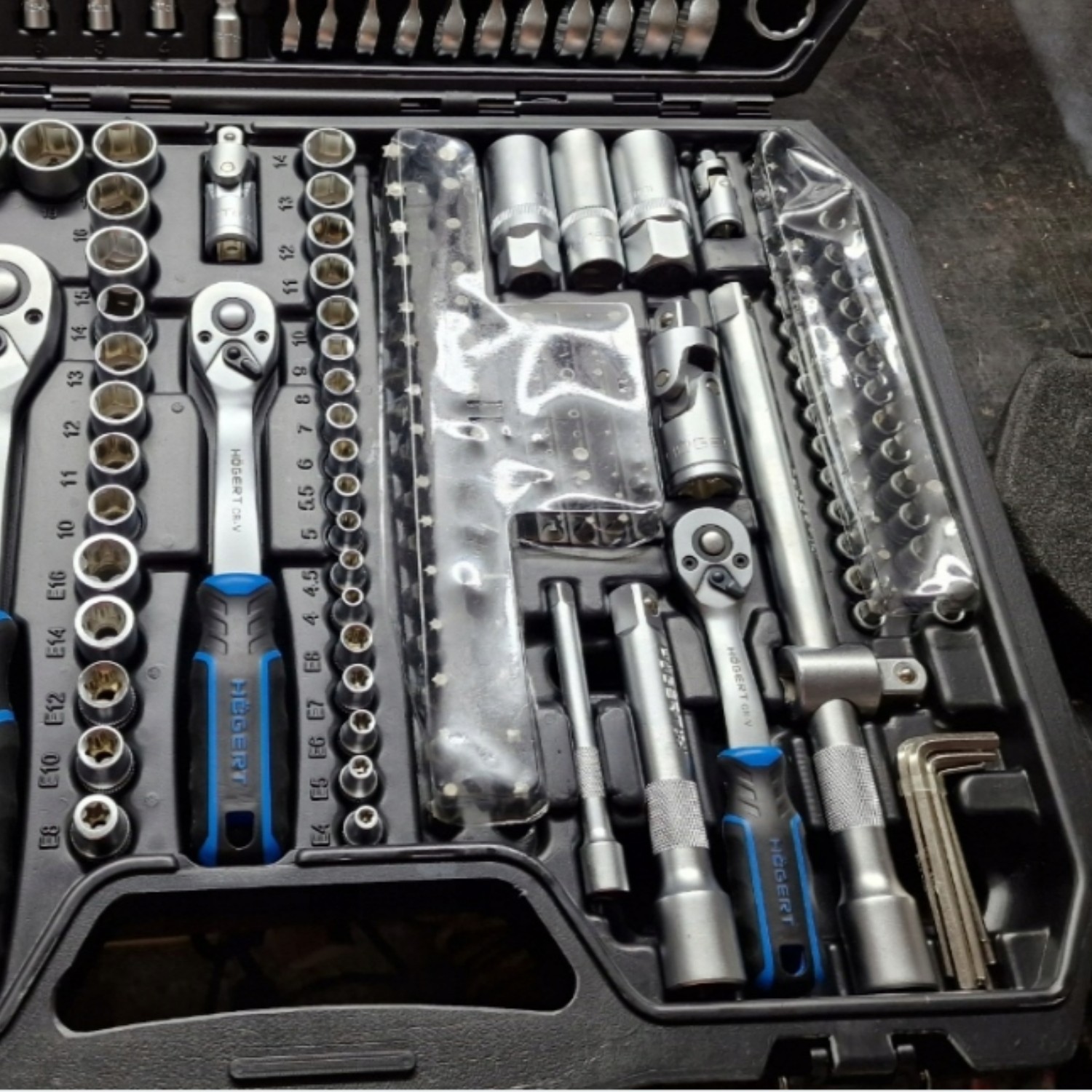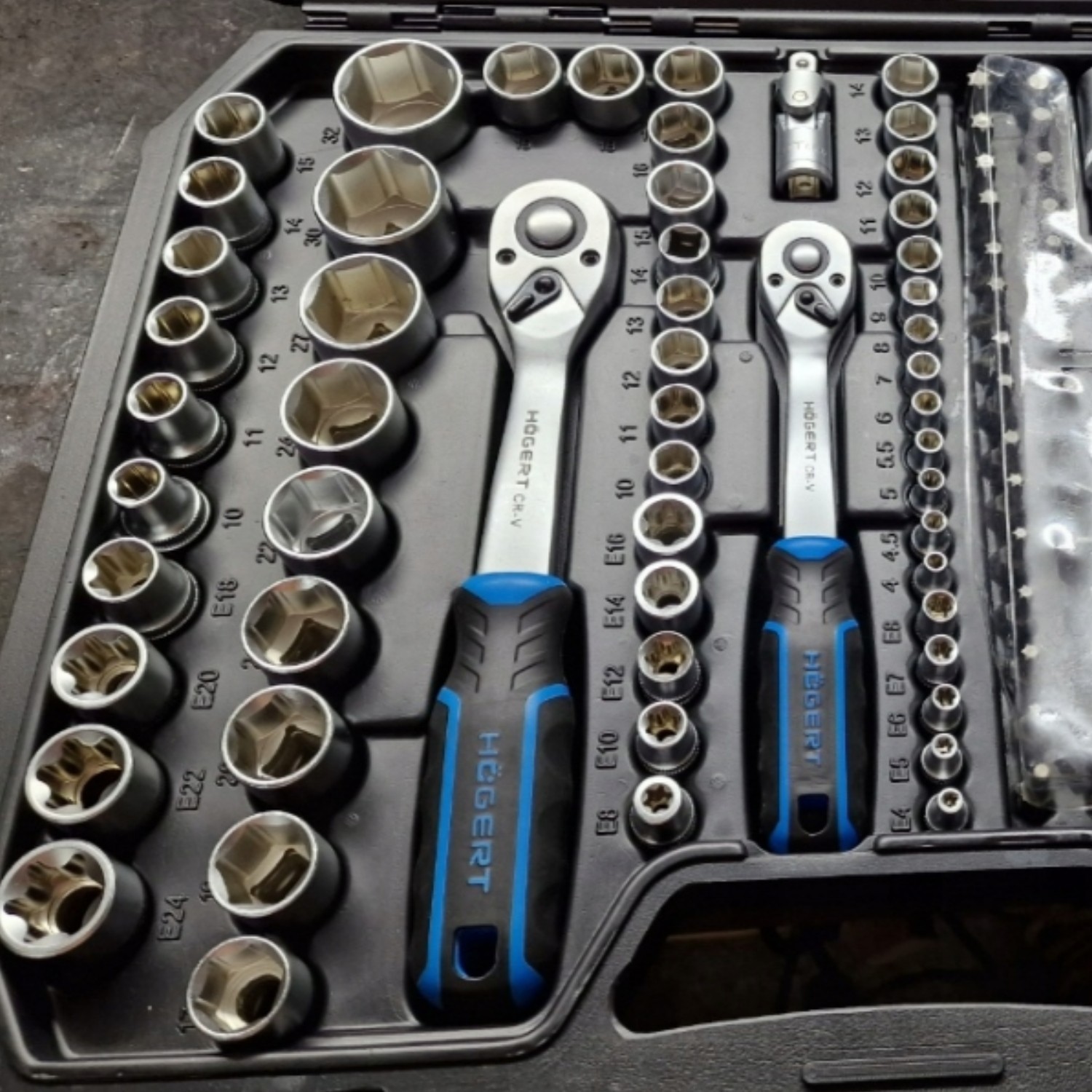 Sockets and accessories are made from chrome vanadium (CrV) alloy steel for strength and wear resistance, while the ratchets use chrome molybdenum (CrMo) components for durability under load. The 72-tooth ratchet mechanisms provide smooth operation and finer control in tighter spaces.