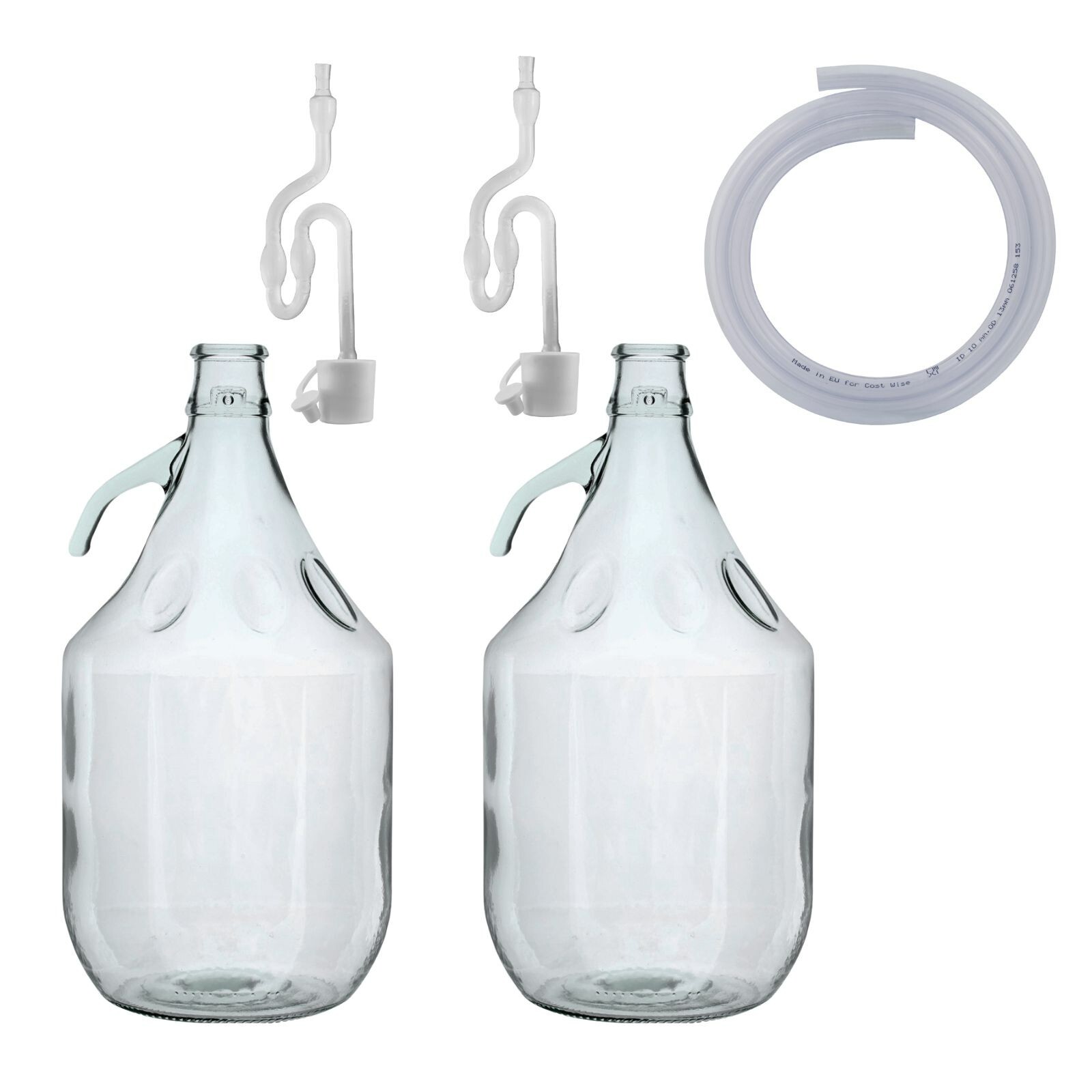 | Set contents | 2x 5L glass demijohns; 2x bungs (with airlock holes and caps); 2x airlocks; 1x PVC syphon tube |