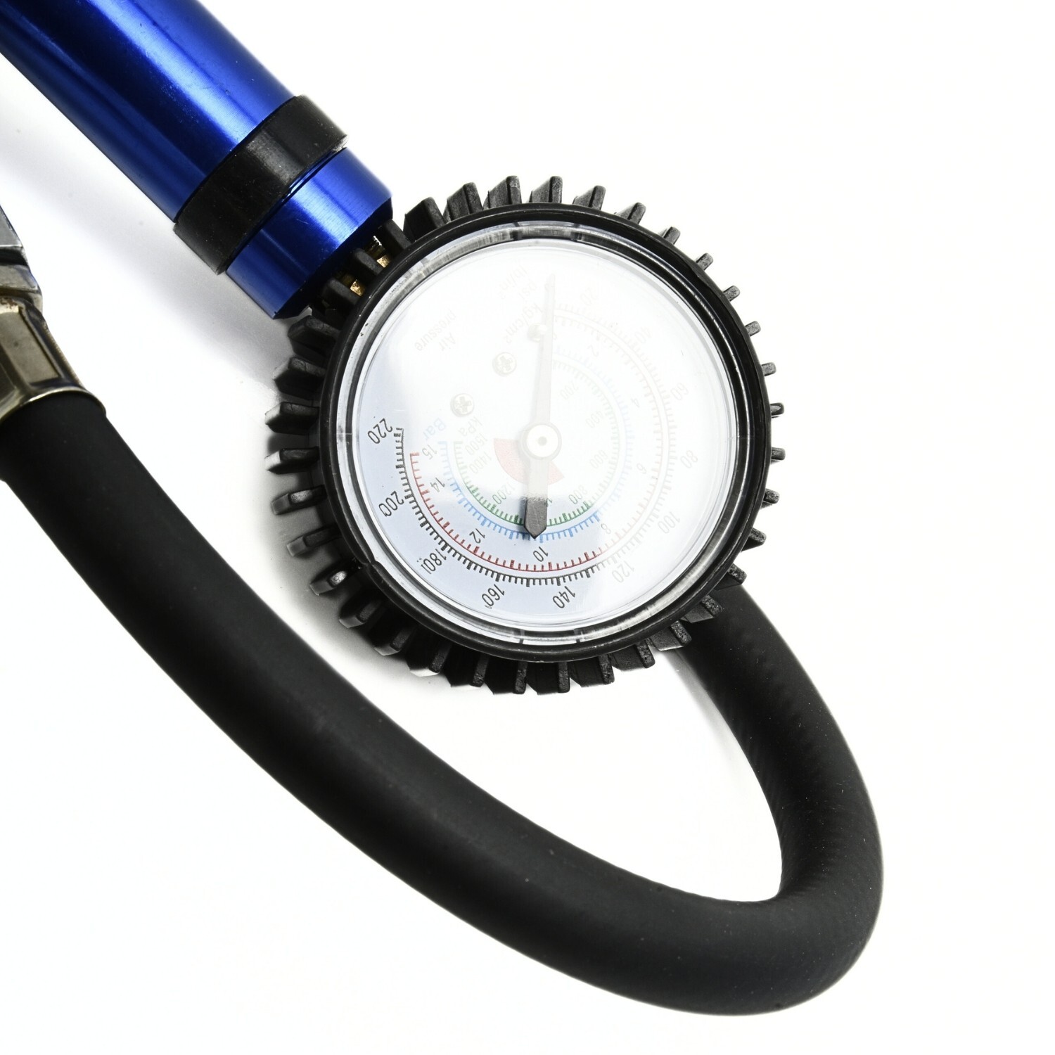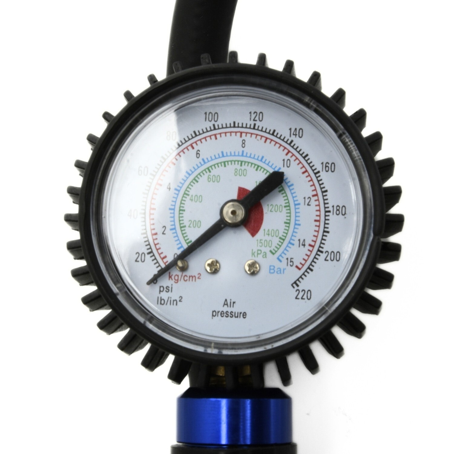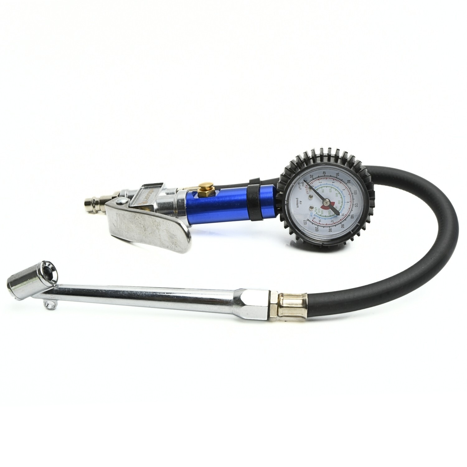 Connect the tool to a compressor air line, attach the nozzle to the valve, then inflate while checking the gauge reading. Disconnect when the desired pressure is reached and store it with your other workshop essentials.