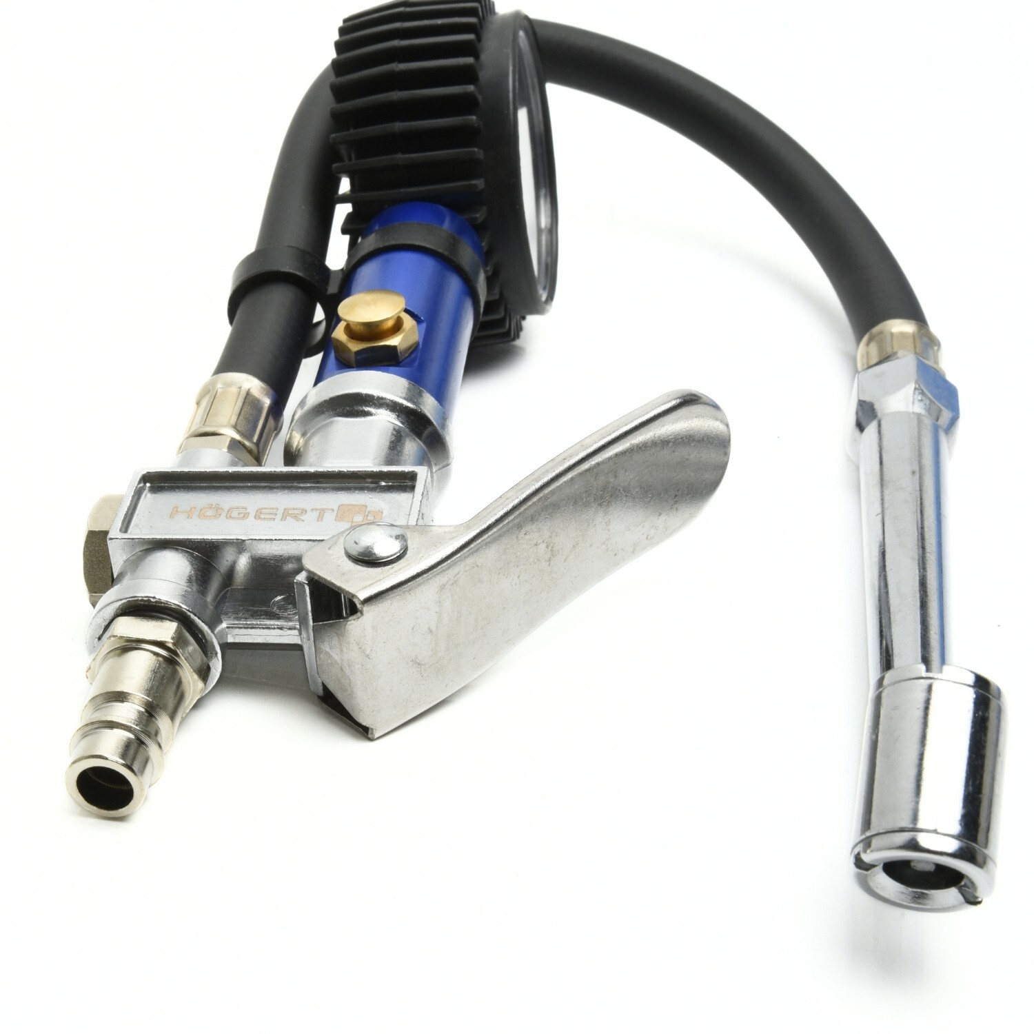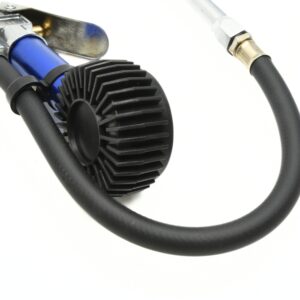 Inflate car, motorcycle and bicycle tyres quickly with this air inflator gun and built-in pressure gauge. The 1/4in quick-release coupling connects easily to most compressor air lines, while the flexible hose helps you reach awkward valves.