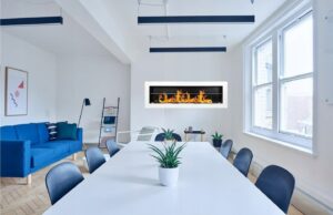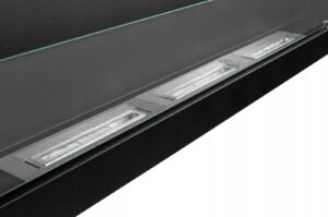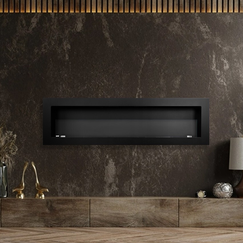 A modern, ventless bioethanol wall fireplace with a sleek black finish and glass safety screen. Three adjustable burners let you control the flame and heat without needing a chimney, gas or electricity. Ideal for adding warmth and ambience to living spaces.