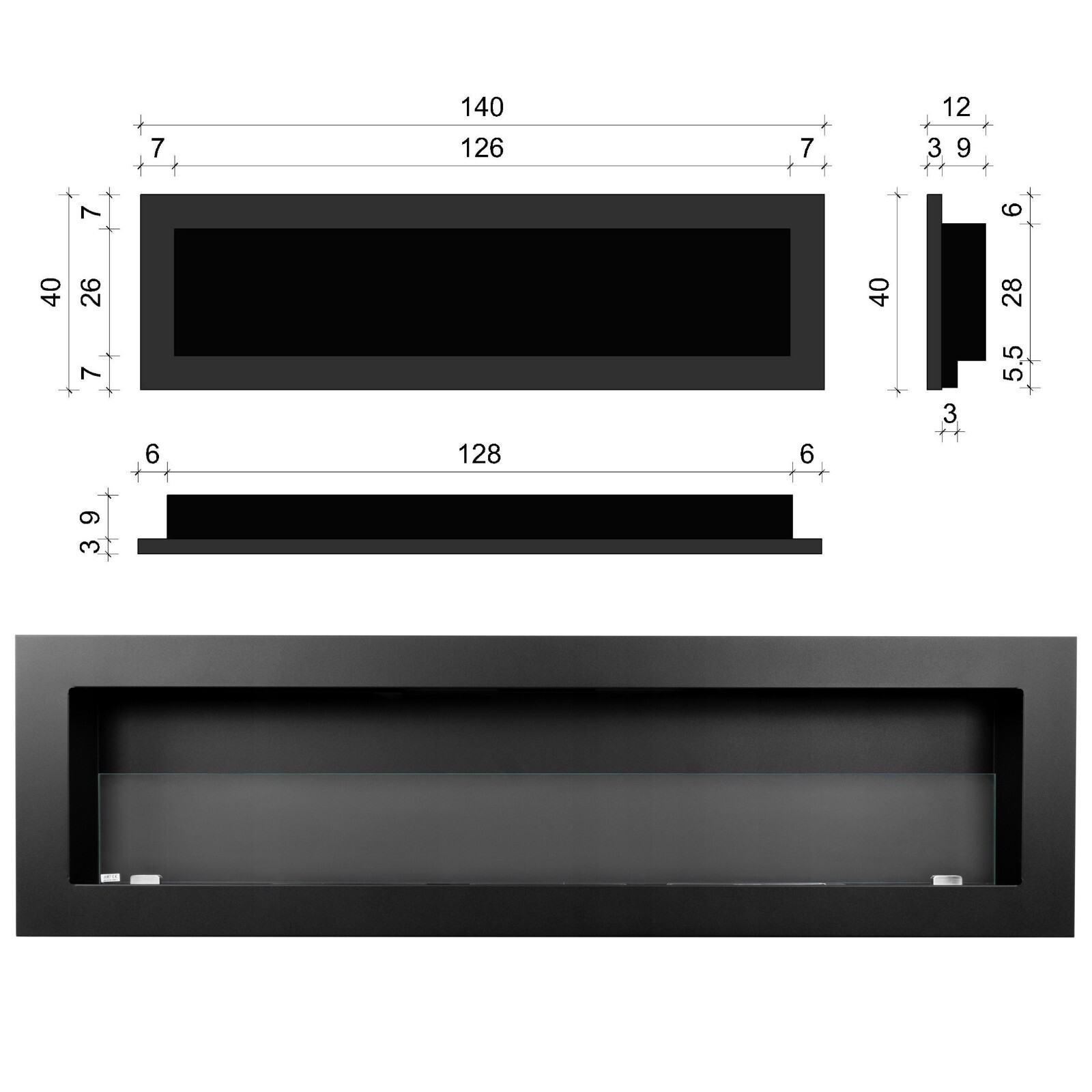 Bioethanol Wall Fireplace Black Steel Glass 1400×400