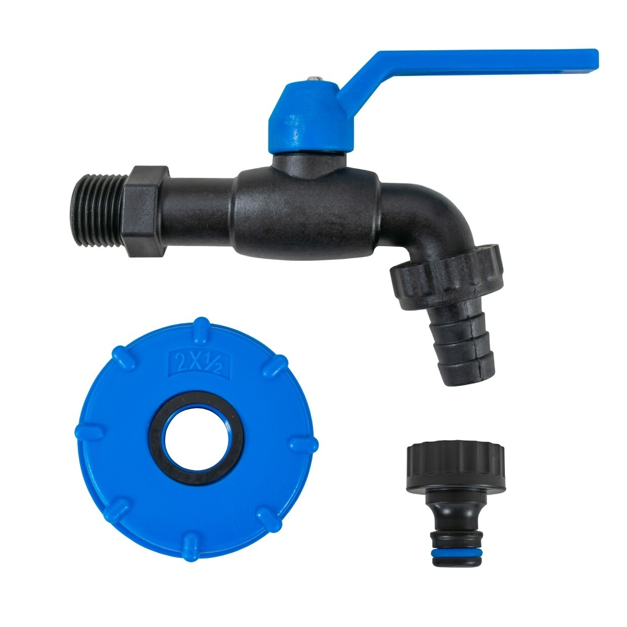 Complete fitting kit for connecting an IBC tank outlet to a garden hose or watering setup. Includes a lever tap for easy flow control and a quick hose link for fast, leak-resistant connection.