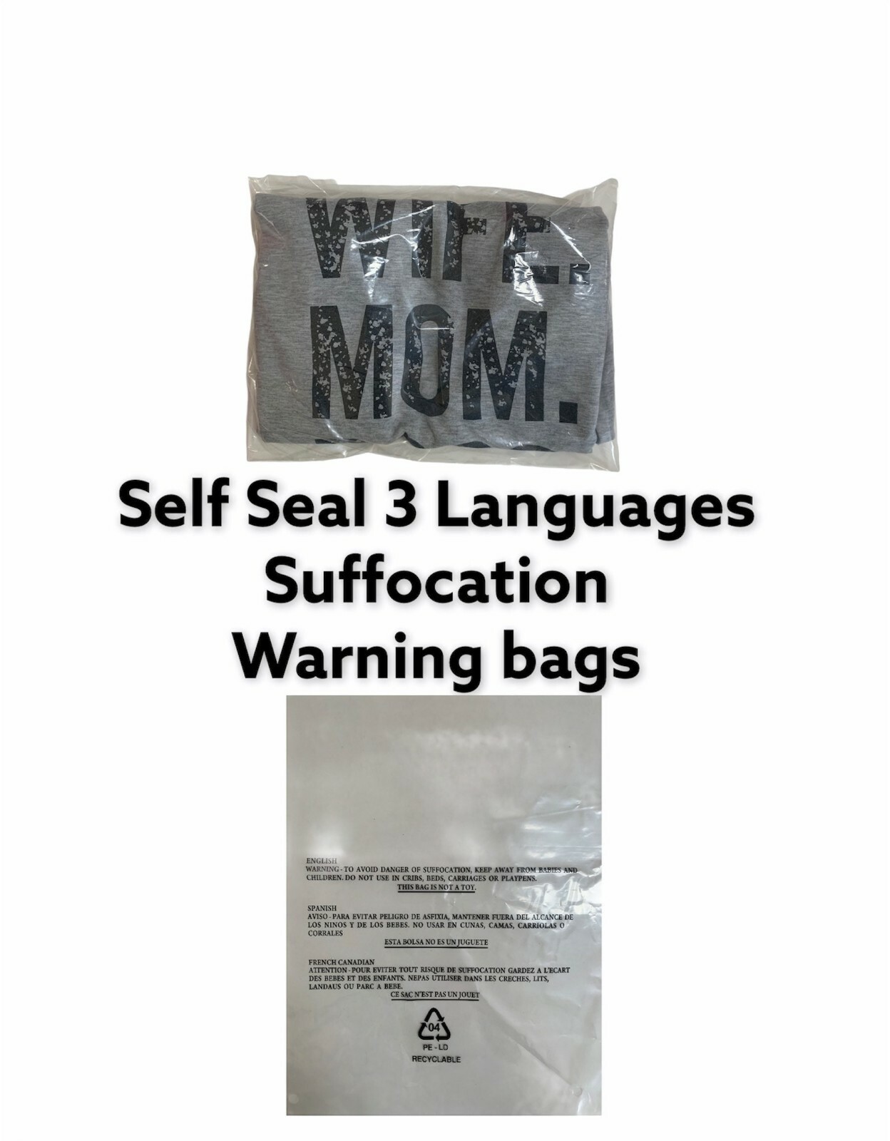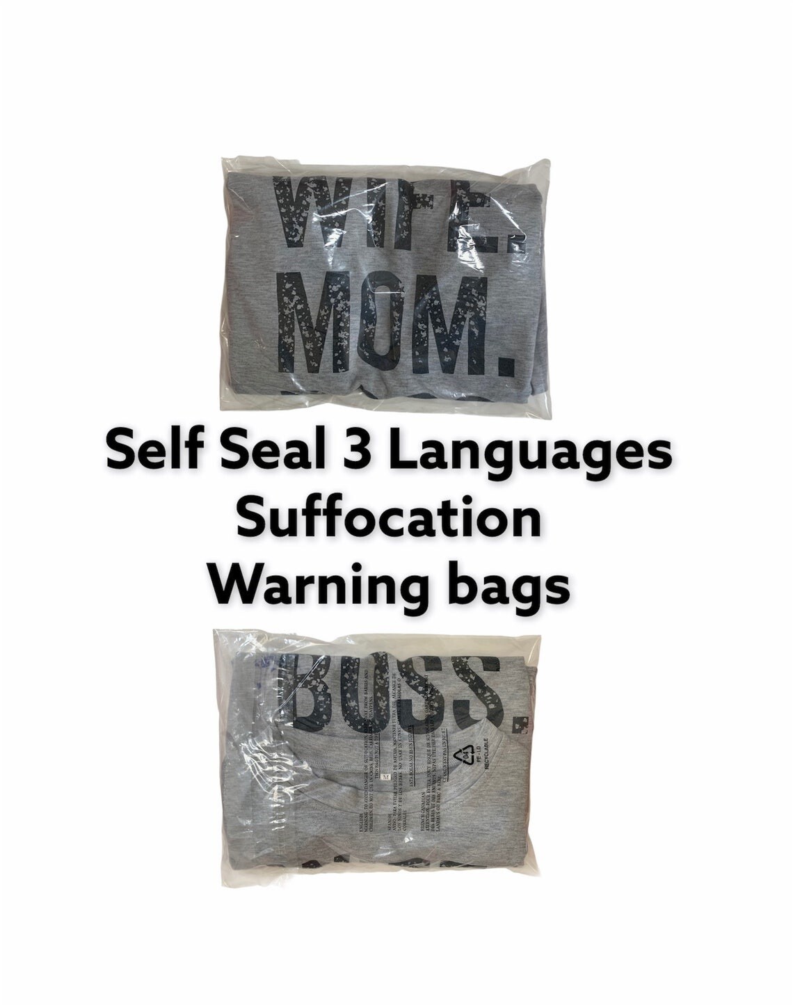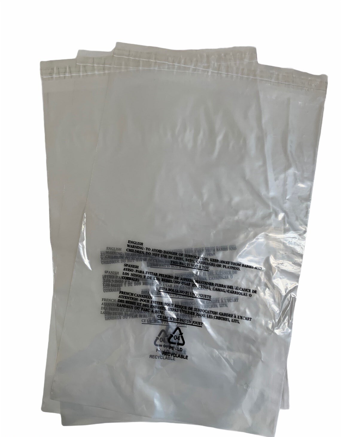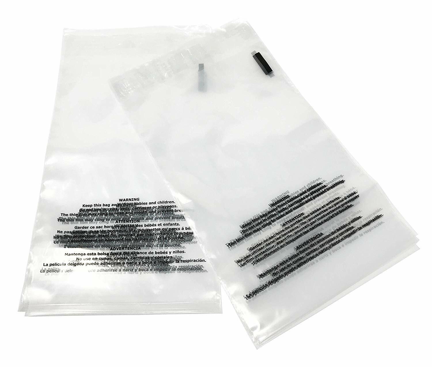 Each bag features a fold-over flap with a peel-off strip to reveal the adhesive, allowing a fast, secure closure without extra tape. The bags are printed with a suffocation warning in multiple languages to support safer handling and compliant packaging, and the clear material helps you check contents without opening.