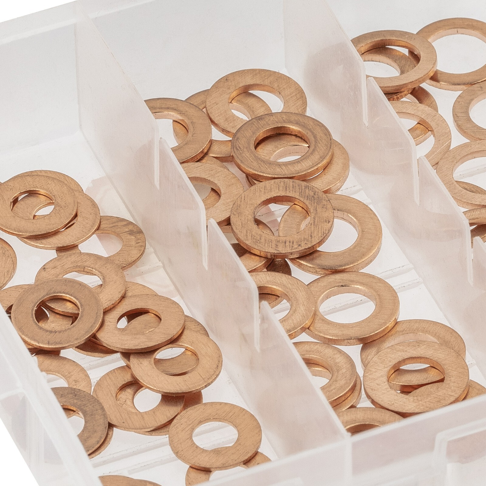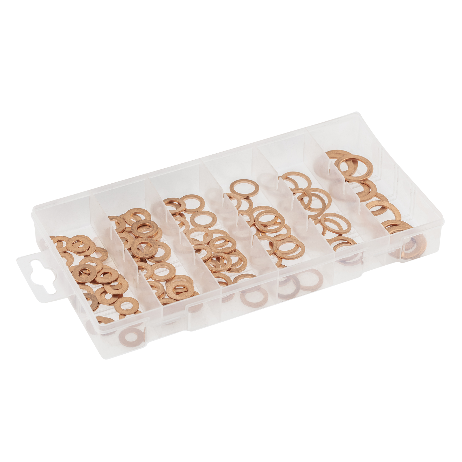 Keep a reliable selection of copper sealing washers close to hand for quick repairs and maintenance. This 110-piece assortment covers six popular sizes, helping you achieve a secure, leak-resistant seal on automotive and plumbing fittings. Supplied in a compartmented storage box for easy picking.