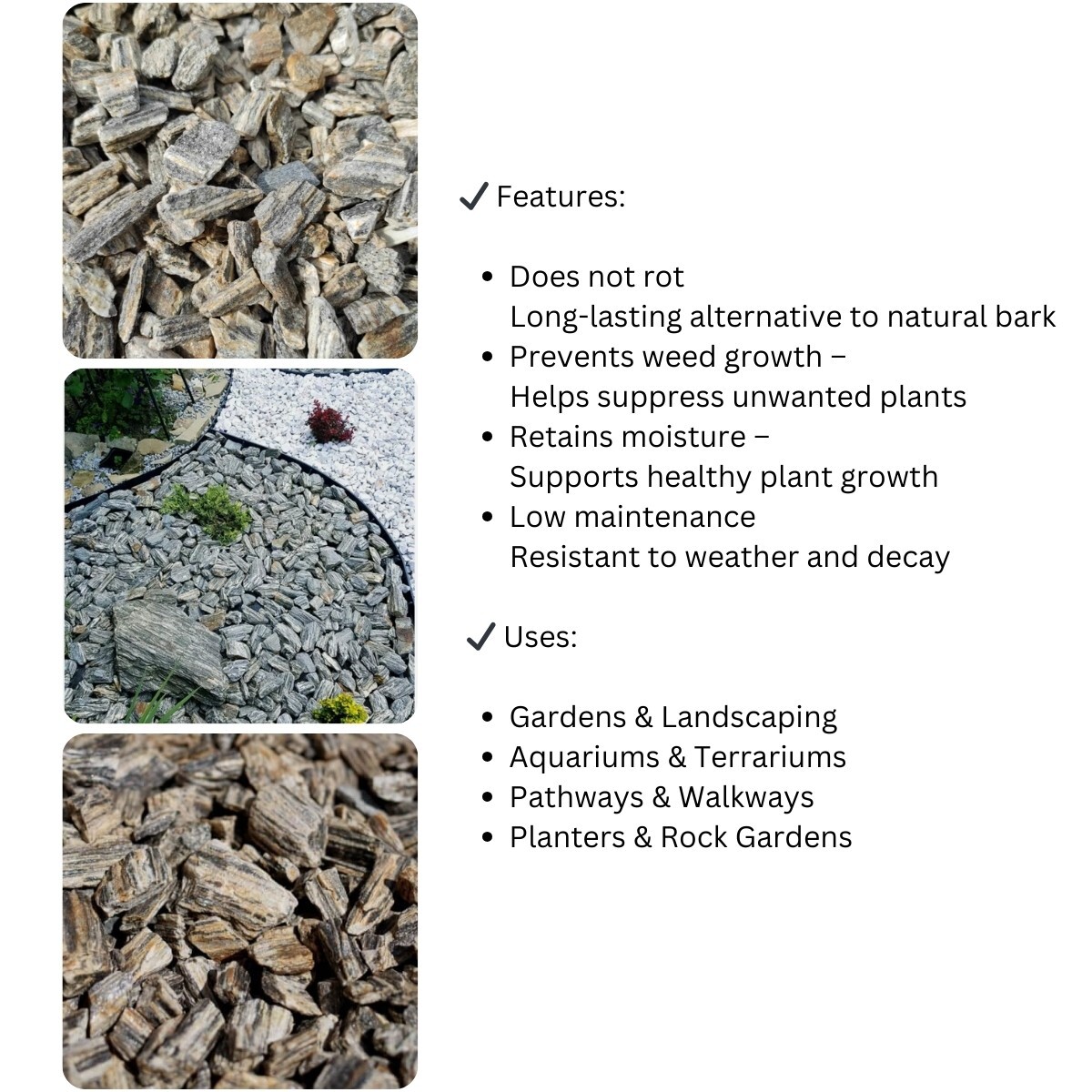 Decorative stone bark chippings for a natural, bark-like finish in borders, pots and around features. A long-lasting alternative to organic mulch that won’t rot, helping to tidy beds and reduce maintenance. Suitable for aquariums and terrariums as a natural-looking substrate.