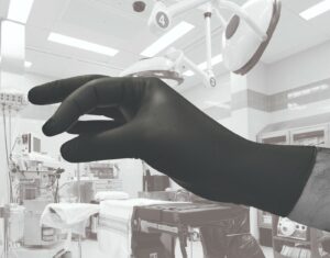 Black powder-free nitrile disposable gloves designed for hygienic, low-allergy hand protection. Textured fingertips improve grip for precise tasks, while the rolled cuff helps reduce liquid roll-back in everyday professional and home use.