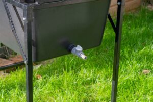 The bath is made from rugged polypropylene and sits securely on a dedicated metal stand. Adjustable legs help you level the setup on uneven ground for a stable wash station. A side drain valve allows fast emptying and helps keep the surrounding area cleaner.