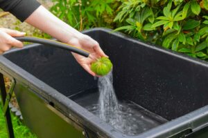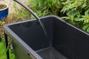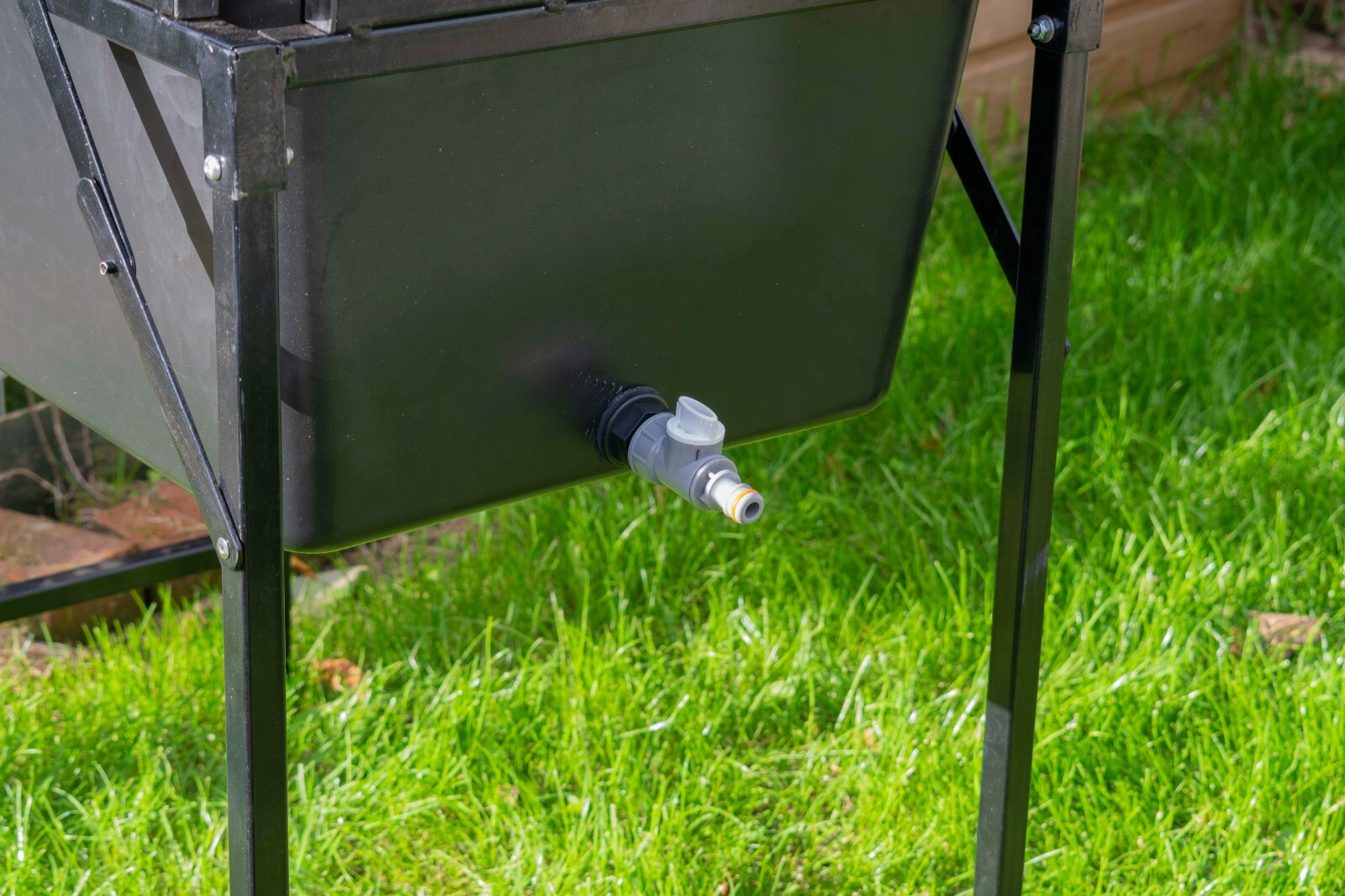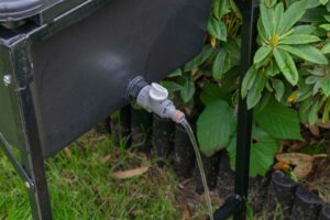 For easy draining, the outlet connects to a standard garden hose using a Hozelock-type quick connector, so you can direct wastewater to a suitable drain or garden area. This is particularly useful for outdoor washing where you want controlled run-off.