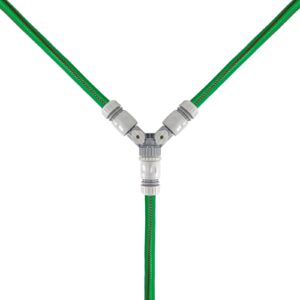 The kit includes a green hose, click-lock connectors, a three-way splitter with valves for controlling hot and cold inputs, and a multi-pattern spray gun. The quick-connect fittings help you attach and remove the set easily for tidy storage after use.