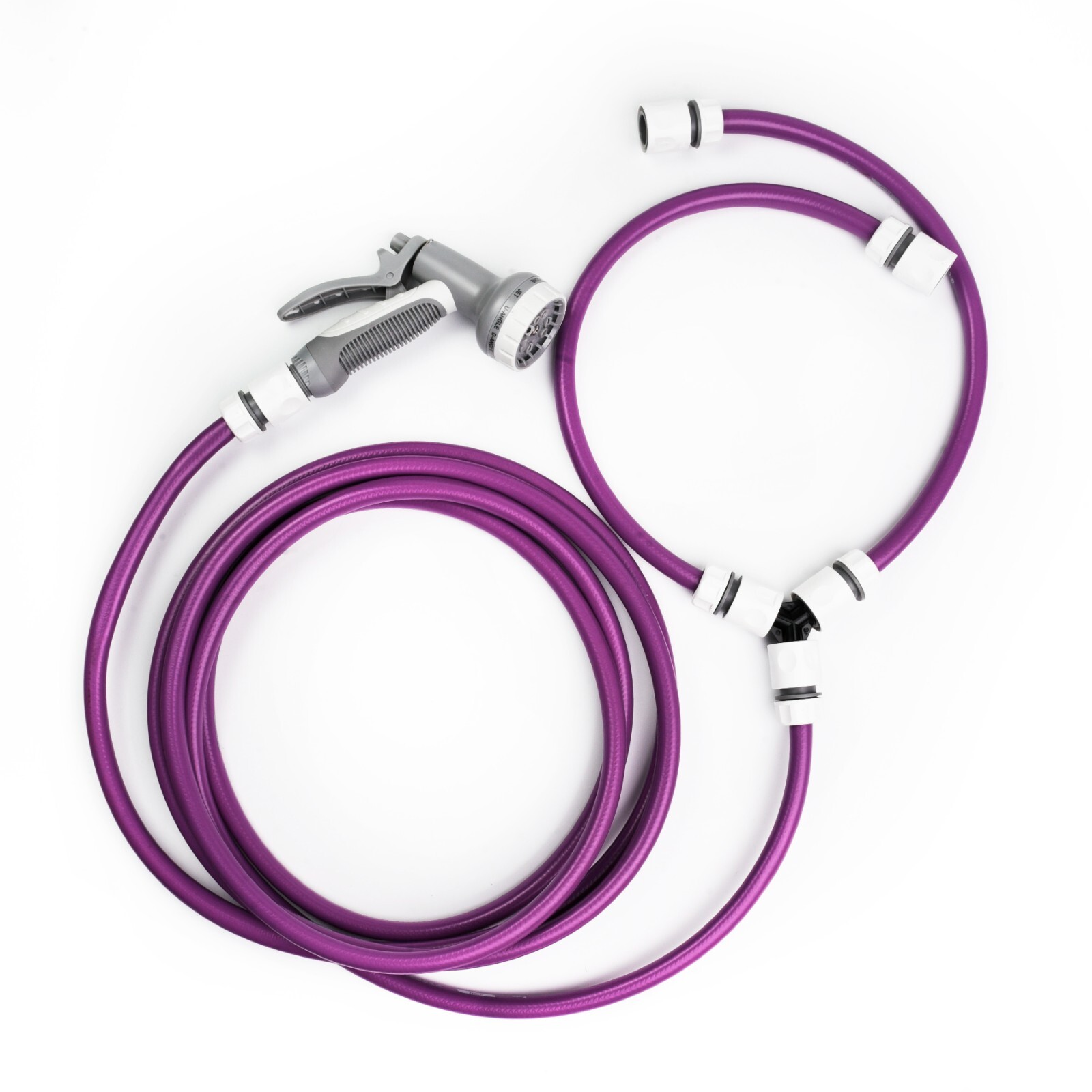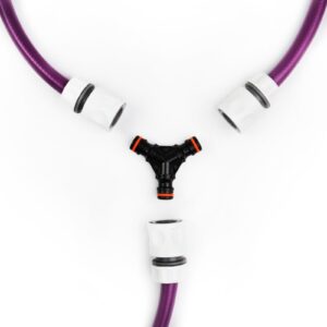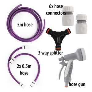 The kit includes a long purple hose with click-lock quick connectors for fast fitting and easy storage. A three-way splitter allows connection to both hot and cold taps, and the multi-pattern spray gun gives you control over water flow so you can switch between a stronger rinse and a softer spray.