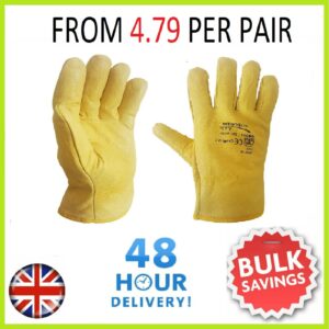 Premium lorry driver-style work gloves made from soft cow grain leather with a warm fleece cotton lining for comfort in cold conditions. Ideal for everyday handling and driving, with an elasticated cuff to help keep a secure fit.