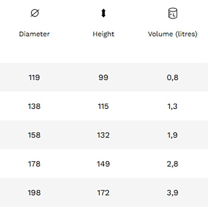 | Capacity | 0.8L ( W 119mm x H 99mm), 1.3L ( W138mm x H 115mm), 1.9L (W158mm x H 132mm), 2.8L (W178mm x H149mm), 3.9L (W198mm x H 172mm) |