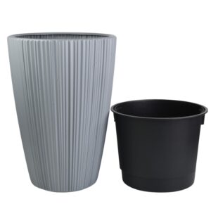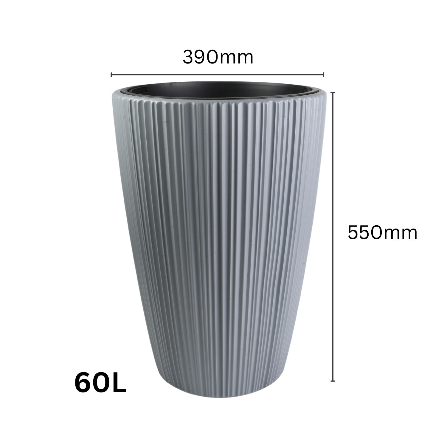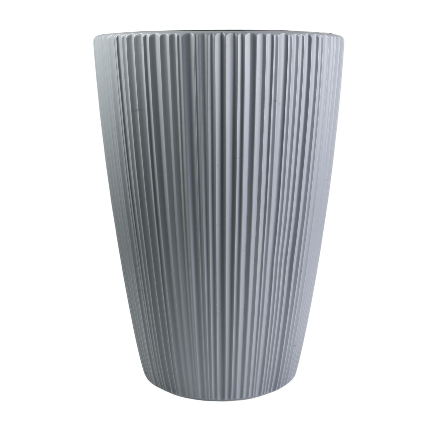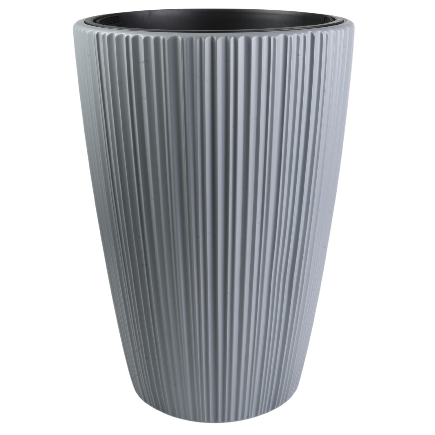 A modern round tall planter in grey with a ridged finish, ideal for styling plants indoors or outside. The removable insert makes planting, lifting and maintenance easier, while the large outer pot creates an eye-catching display.