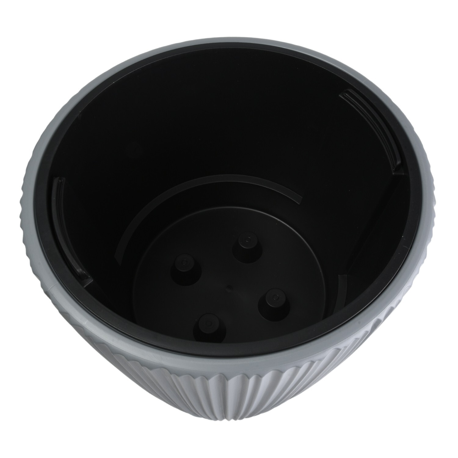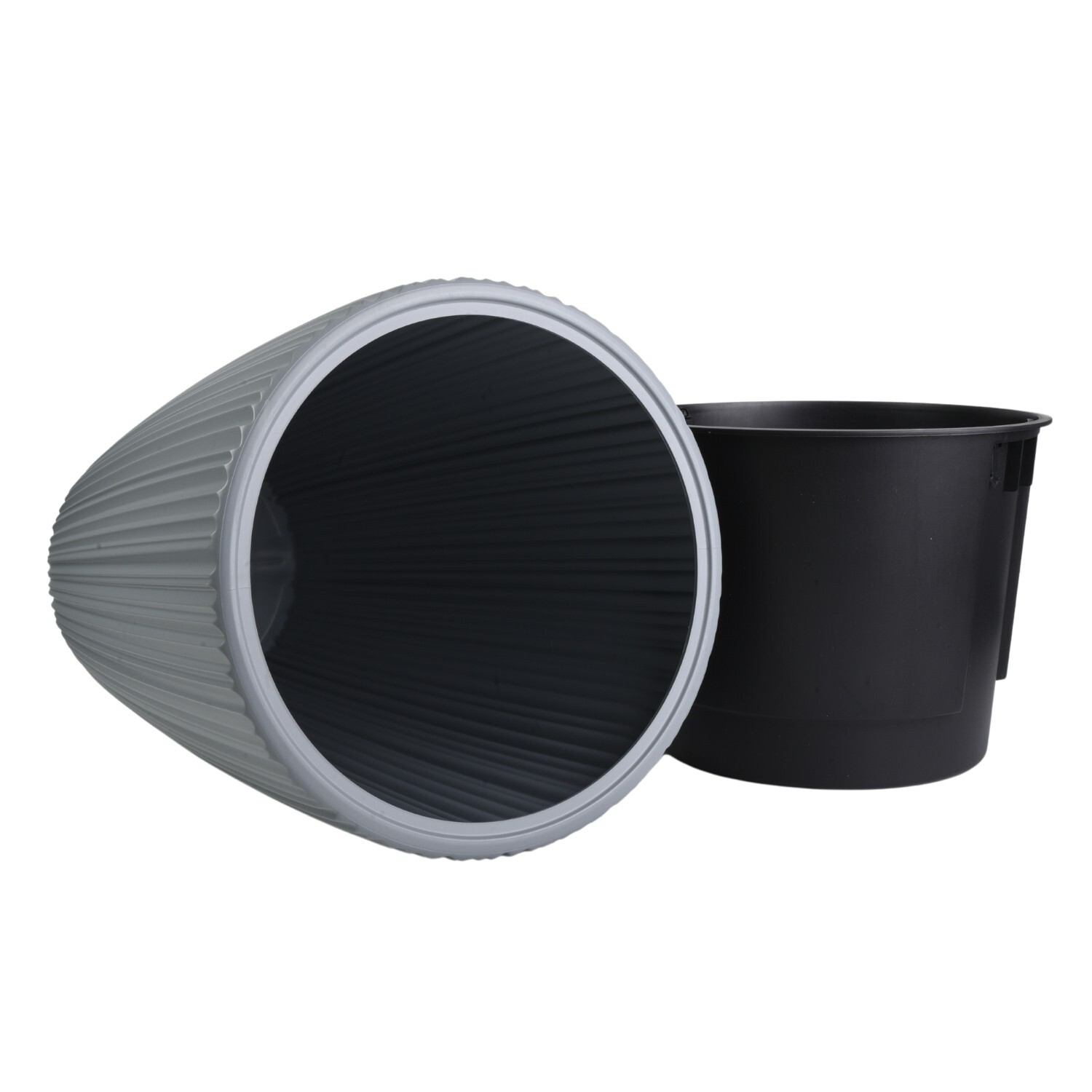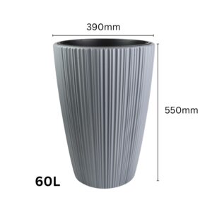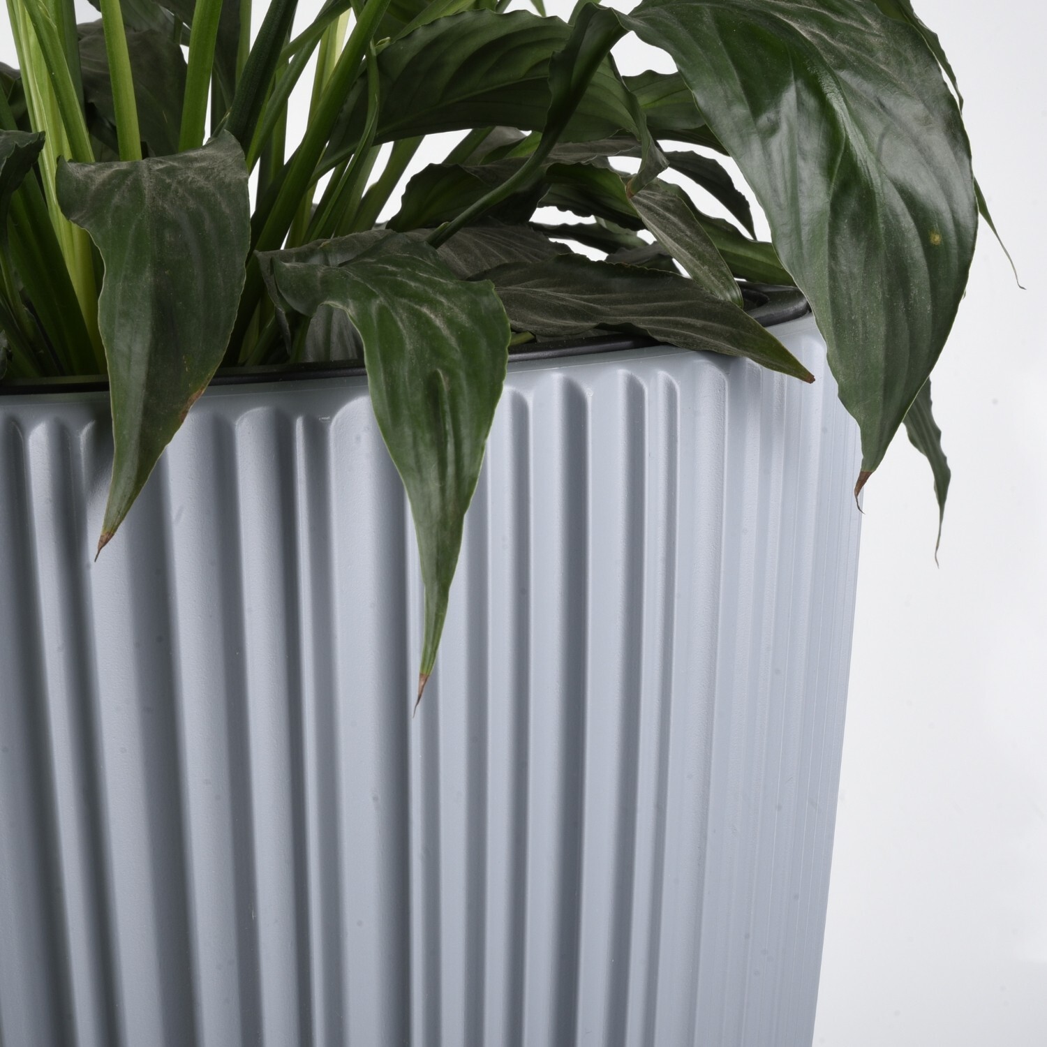 A modern round tall planter in grey with a ridged finish, ideal for styling plants indoors or outside. The removable insert makes planting, lifting and maintenance easier, while the large outer pot creates an eye-catching display.