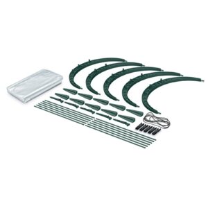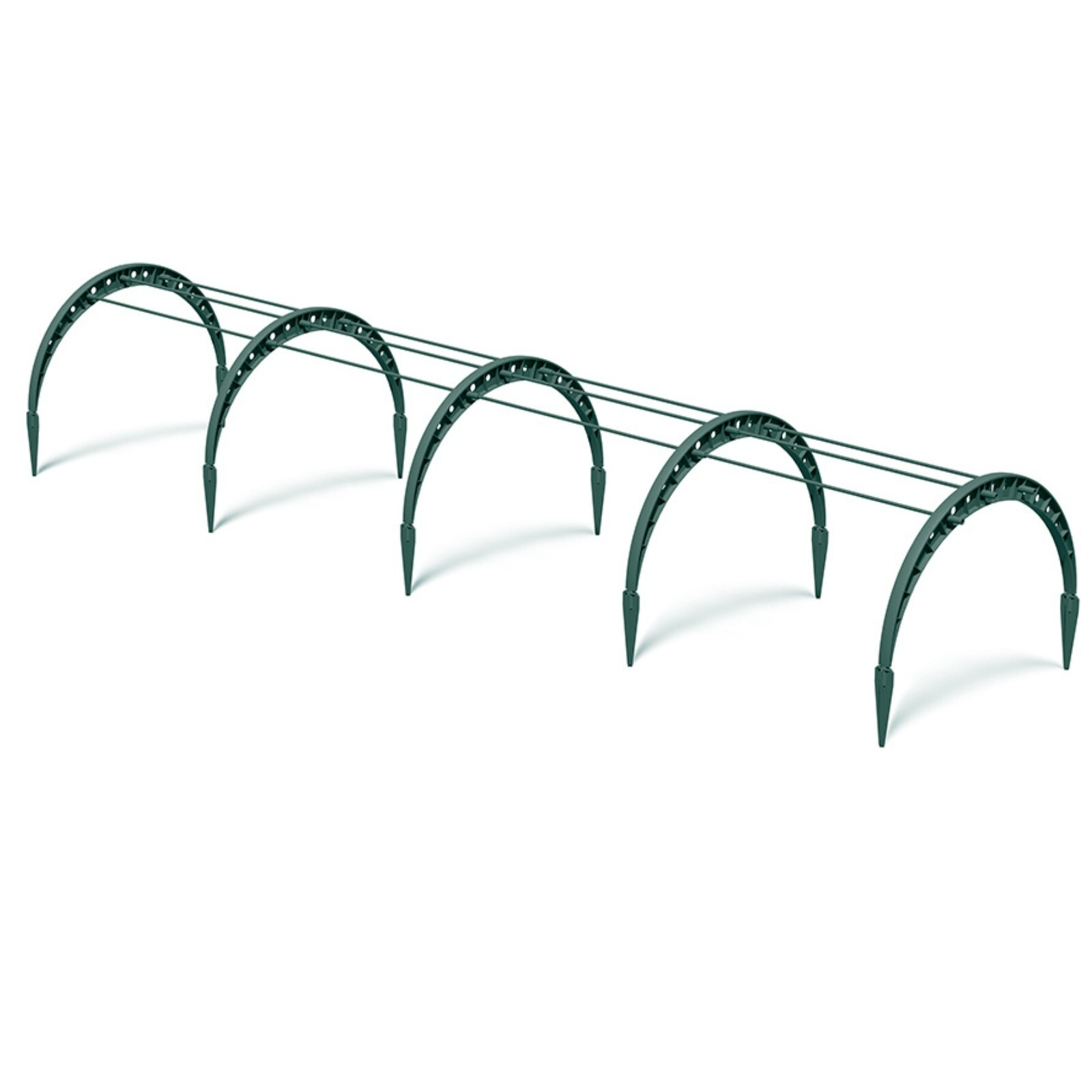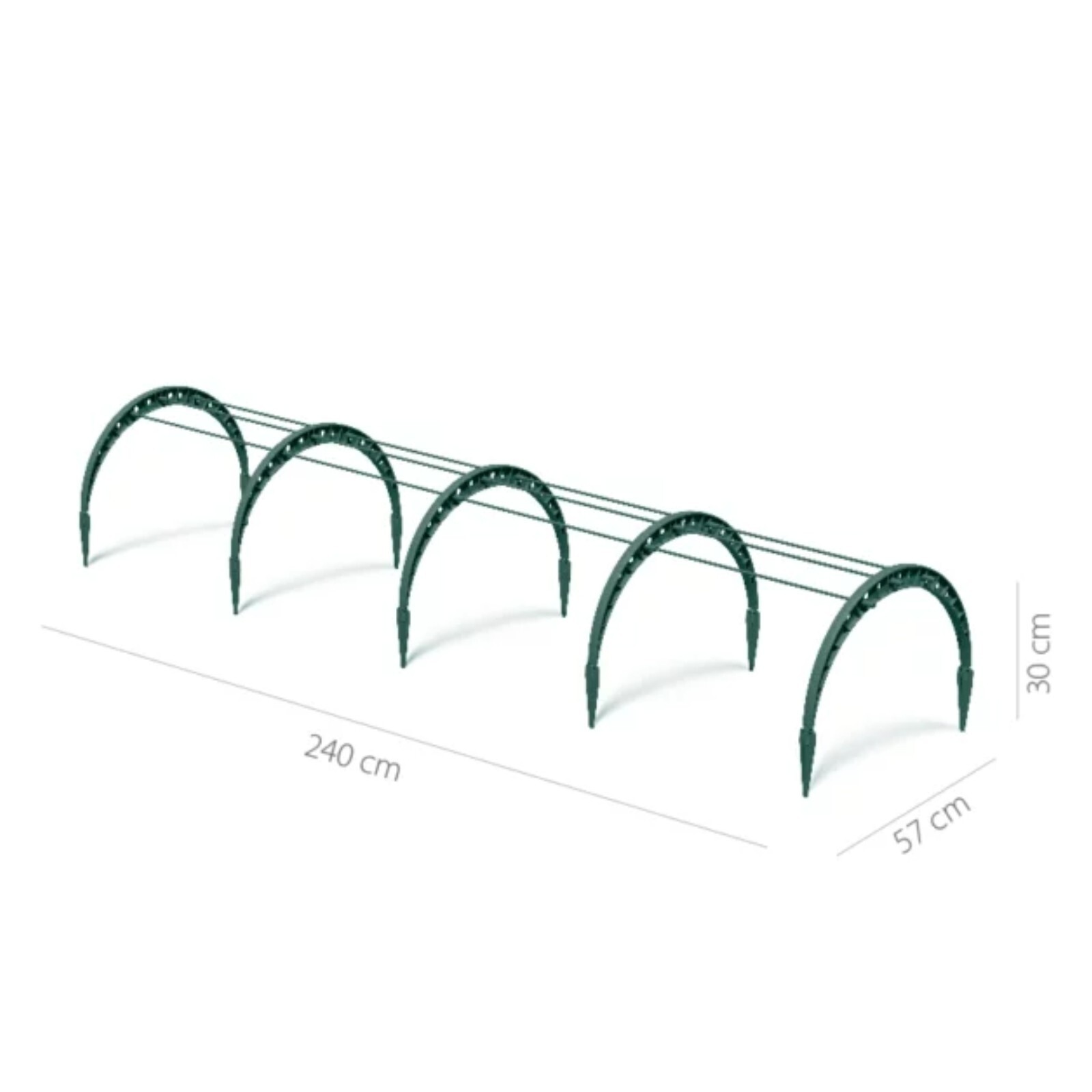 Compact low polytunnel greenhouse to protect young plants and help extend the growing season. The foil cover shields crops from wind and light rain, while the green frame keeps it neat and unobtrusive in the garden.