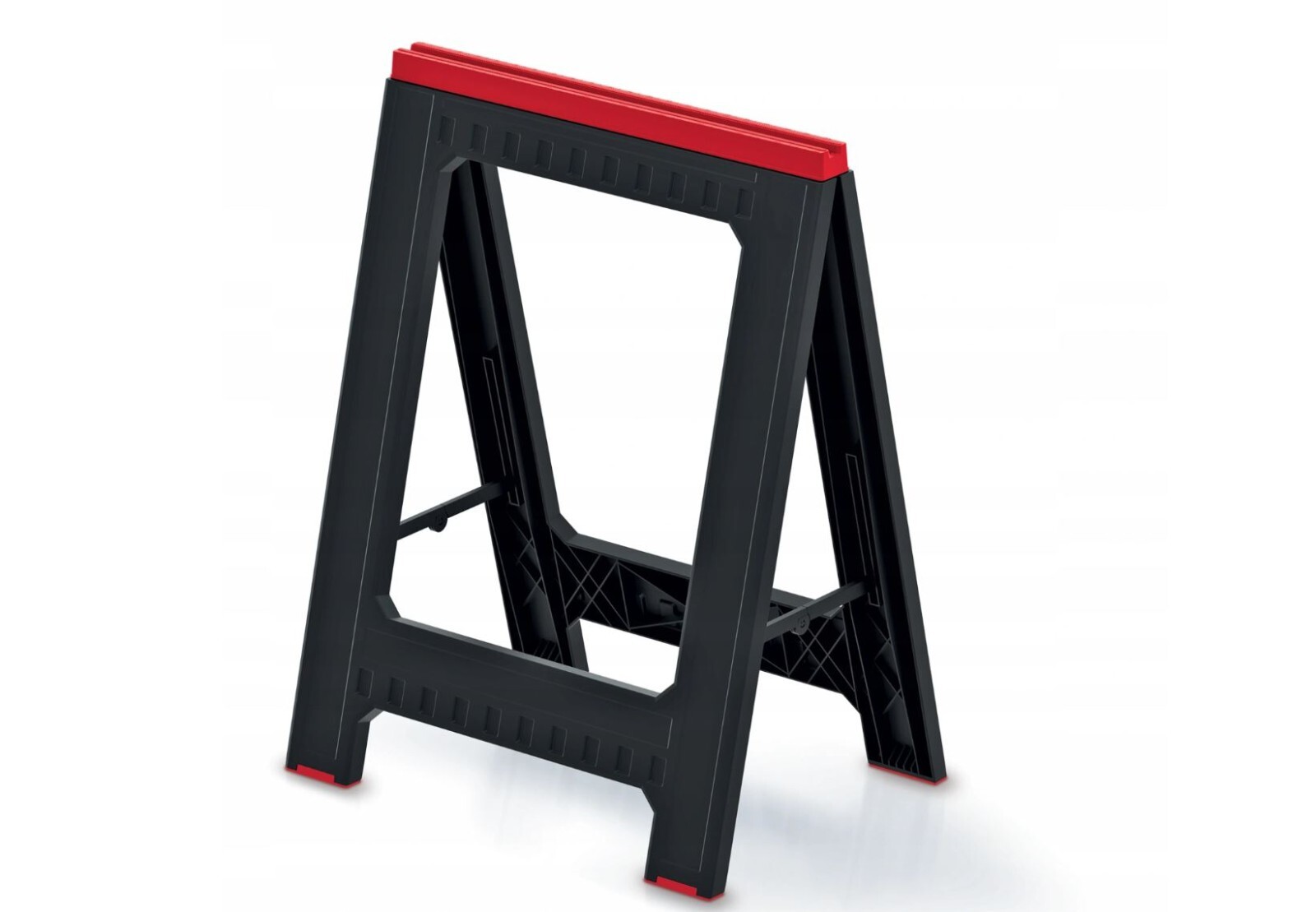 A folding sawhorse trestle stand for stable support when cutting and assembling materials in the workshop or on site. Quick to set up and easy to store, with non-slip feet to help reduce movement during use.
