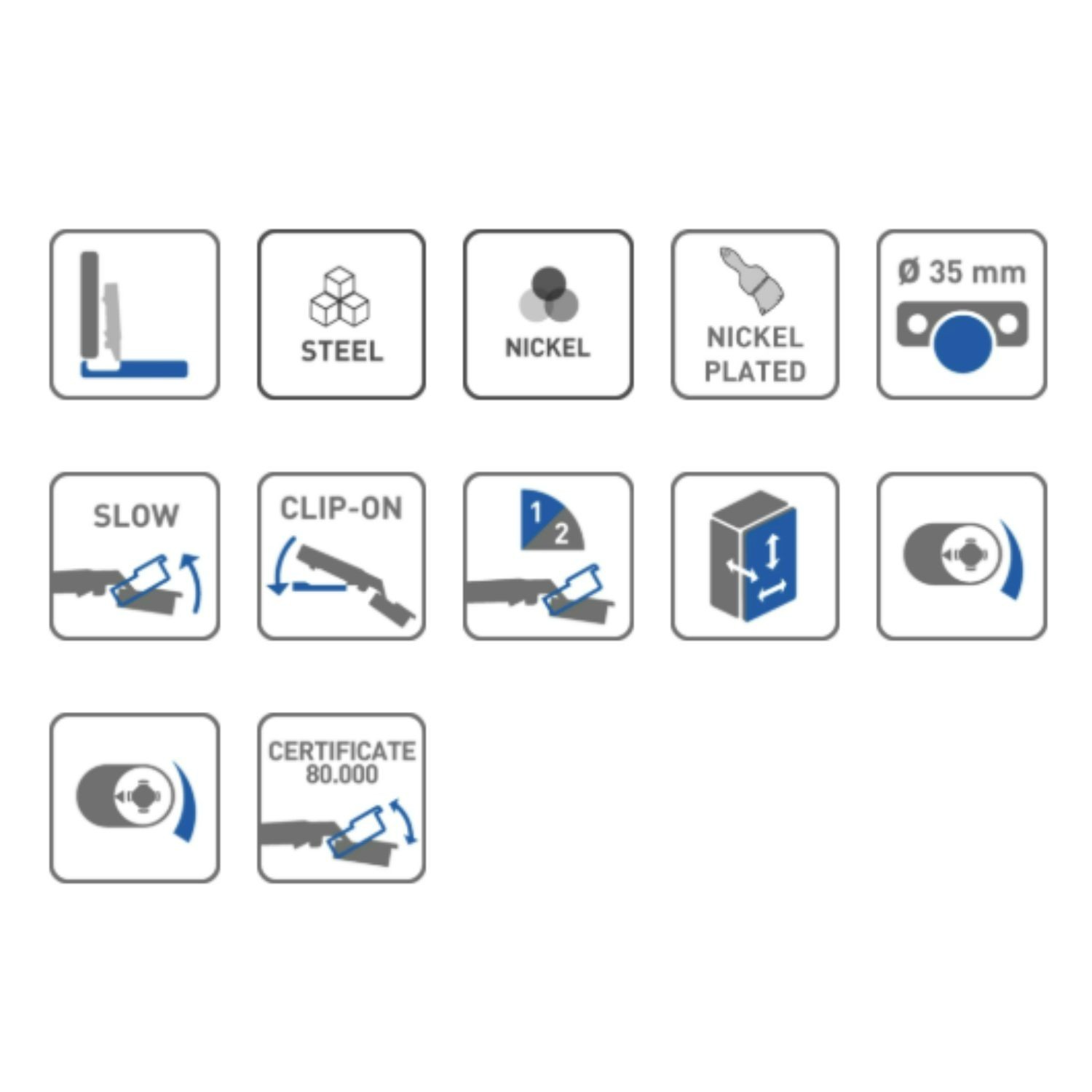 The hinge uses a clip-on fitting for straightforward installation and removal when needed. It also includes 3D screw-style adjustment, allowing you to fine-tune door position for an even reveal and reliable closing action after fitting.