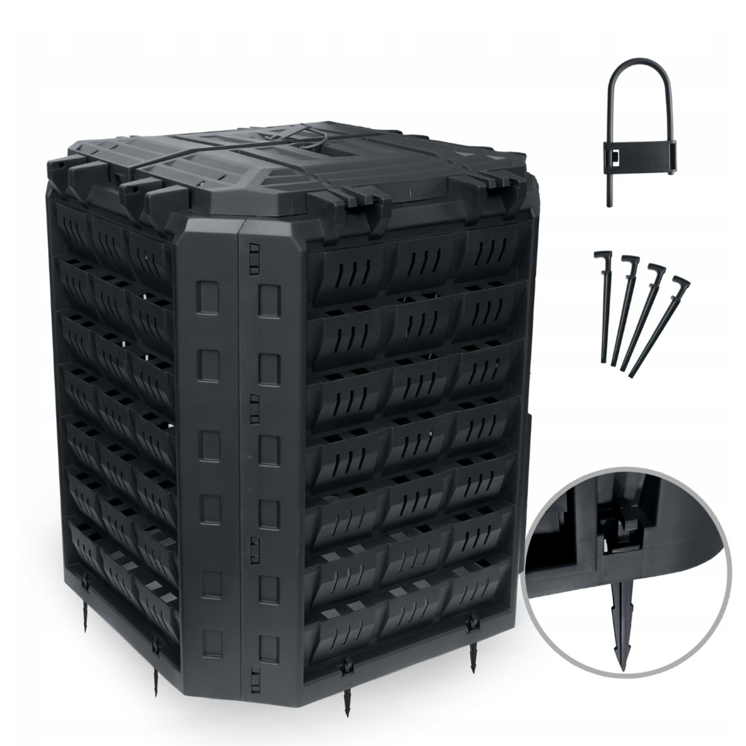 Supplied with ground pegs for added stability, it’s a practical choice for routine composting in outdoor spaces. Ideal for eco-minded households, allotments and gardeners looking for a straightforward, tool-free composting solution.