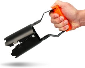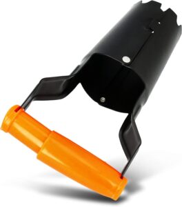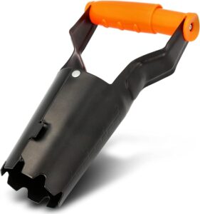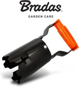 Made from sturdy steel with a comfortable ergonomic handle, it’s built for regular garden use. The serrated lower edge helps it bite into firmer ground, while the trigger-style release lets you drop the soil back to refill the hole with minimal mess.