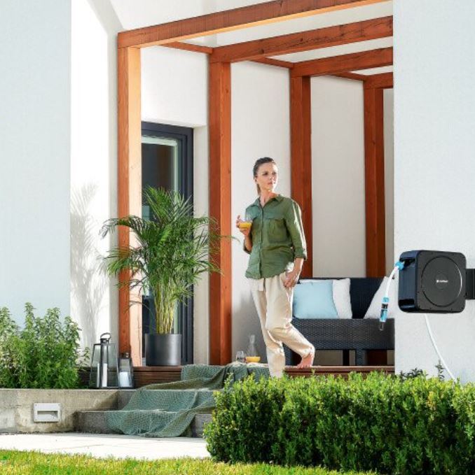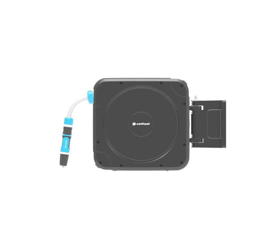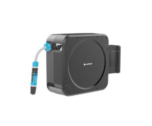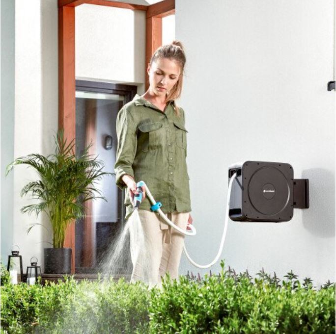 Built for outdoor use, the reel housing is made from UV-resistant materials to help it stand up to regular use in the garden. An effective braking mechanism regulates rewind speed, and a rotation lock helps prevent the reel swinging into walls or the building façade.