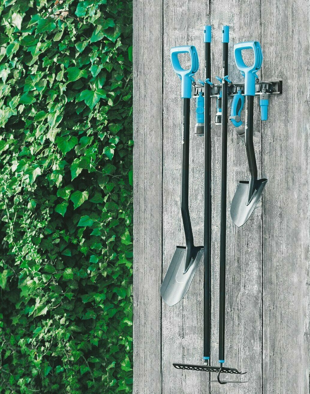 Use it for garden forks, spades, rakes, brooms and mops, as well as general workshop tools with suitable handles. The extra holders are handy for smaller irrigation accessories such as connectors and sprinklers, keeping everything in one place.