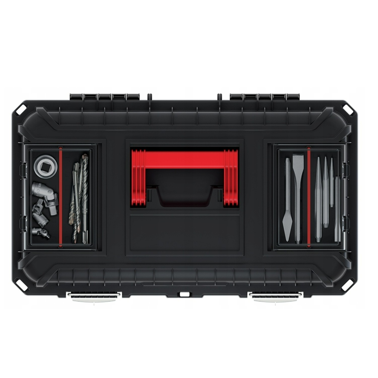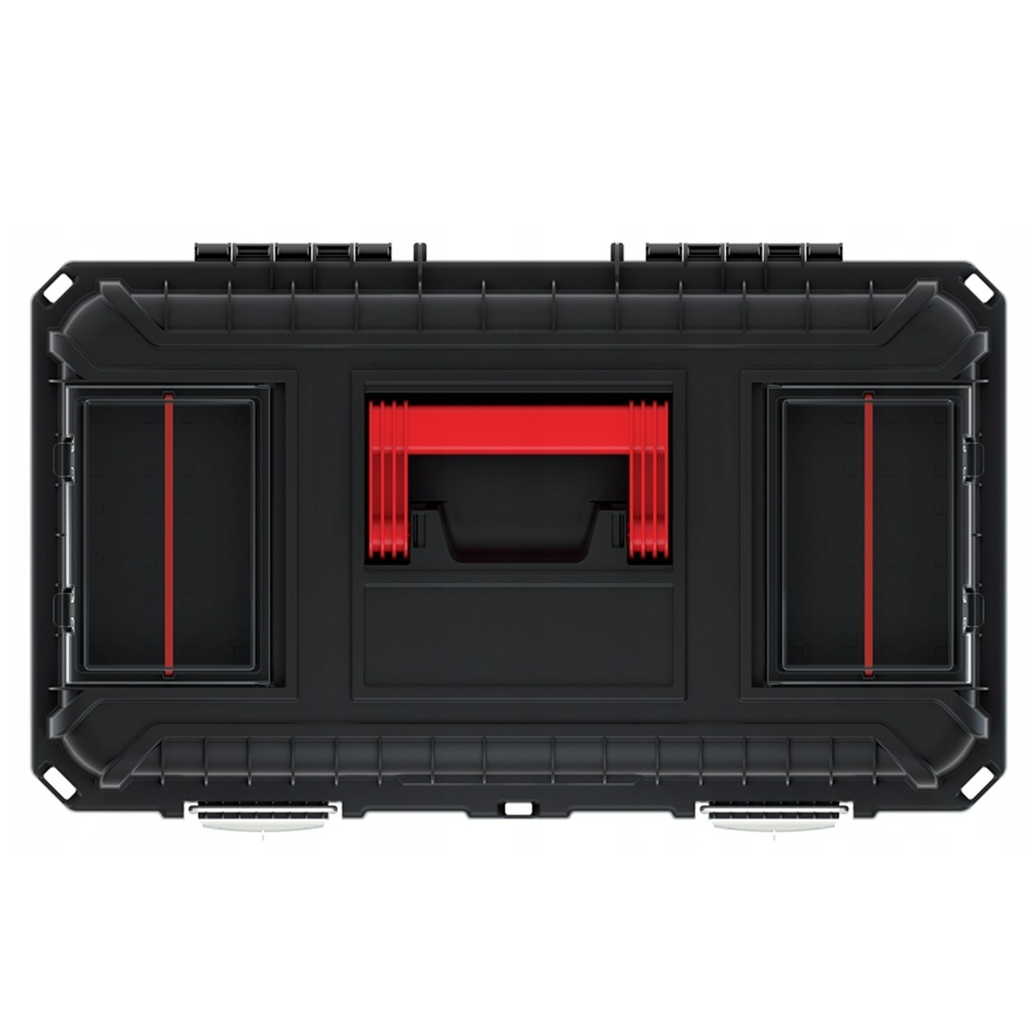 Inside, an internal carry tray keeps frequently used tools accessible, and integrated transparent organisers with removable dividers help you sort screws, fixings and small components. This makes it ideal for tradespeople and DIYers who want a tidy, easy-to-manage set-up.