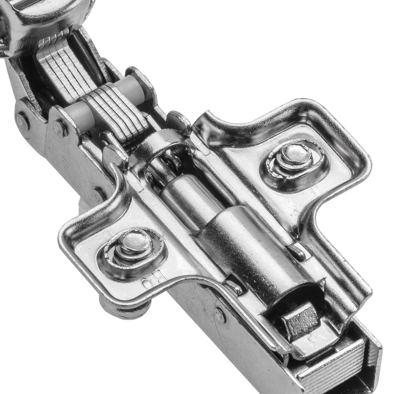 Straight clip-on cabinet hinge for overlapping doors, with a hydraulic soft-close action to prevent slamming. Helps your cupboard doors shut smoothly and quietly, and is easy to fit or remove for adjustments or maintenance.