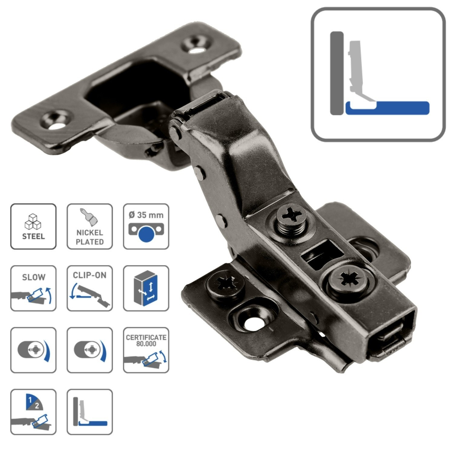 Quiet, soft-close inset/recessed cabinet hinge for a smooth, controlled door action. Clip-on fitting and built-in 3D adjustment help you align doors neatly and reduce slamming for a more premium finish.