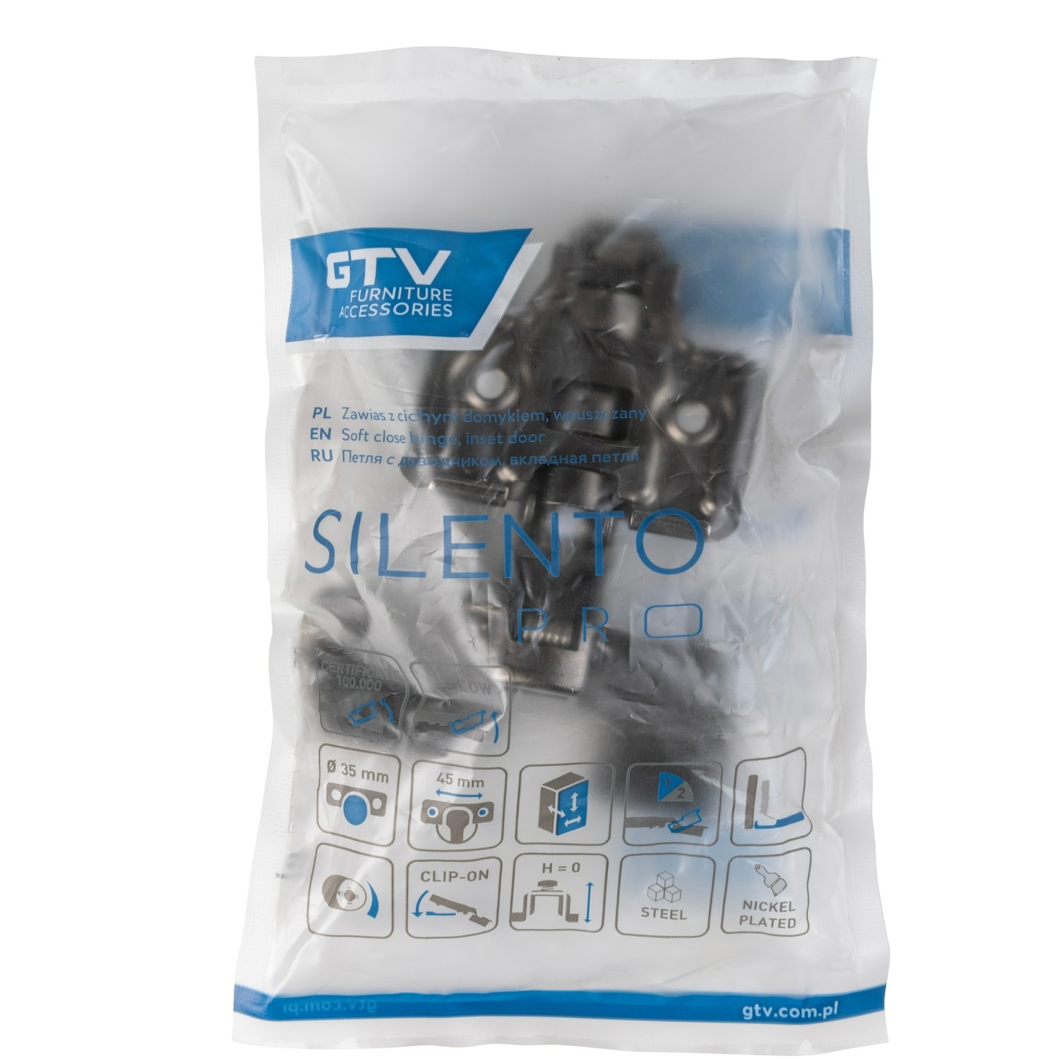 Made from steel with a durable plated finish, the hinge includes an integrated silent-close mechanism and a two-stage spring design for controlled movement. An eccentric adjustment system provides convenient fine tuning, while the clip-on mounting style is designed to make fitting and removal simpler during installation or maintenance.