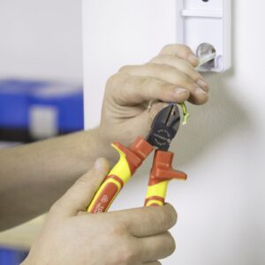 VDE-certified insulated side cutters for safe, clean cutting of electrical conductors and wires. Designed for professional use on live installations up to 1000V, with an ergonomic grip to reduce hand fatigue during repetitive cutting.