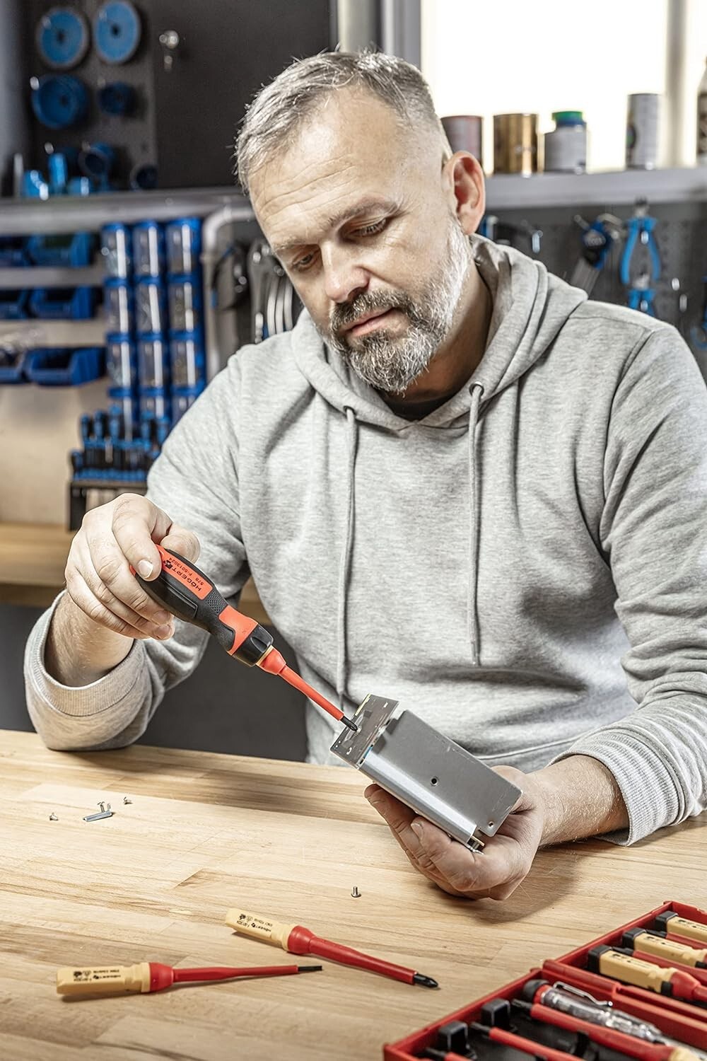 VDE-certified insulated screwdriver set for safer work on live electrical systems up to 1000V. Magnetic tips help hold screws securely for faster, more accurate work, while the comfortable grip gives better control in tight spaces.