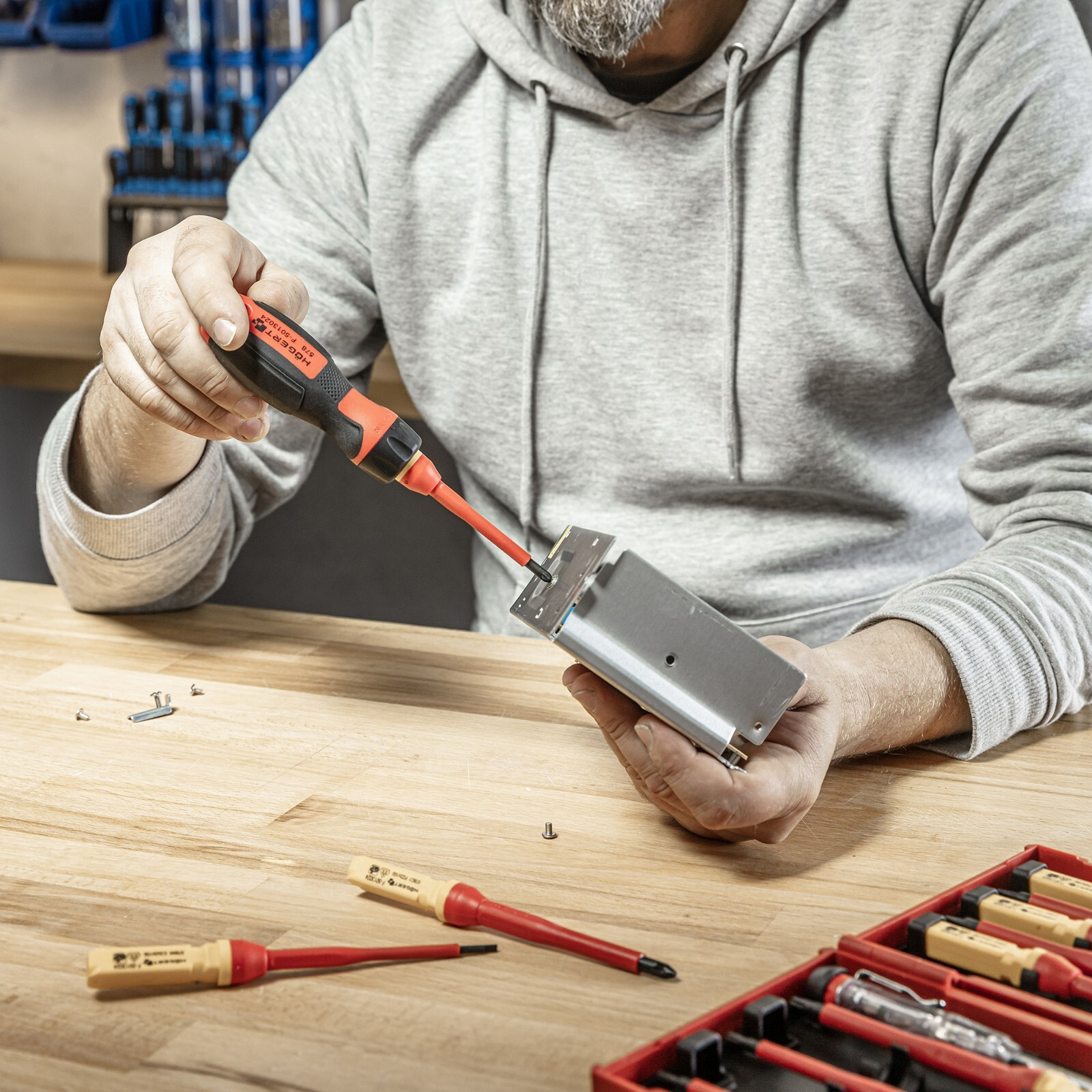 The screwdrivers are VDE certified to the relevant safety standard and feature insulated shafts for protection. The blades are made from durable S2 alloy steel to resist wear, and the ergonomic, anti-slip handle is shaped for controlled turning and comfortable use over longer jobs.