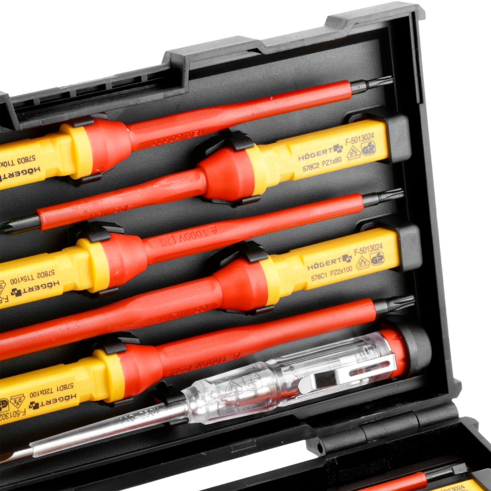 Work more safely on electrical tasks with this 13-piece VDE insulated screwdriver set, designed for use up to 1000V. A included voltage tester helps you quickly check for live circuits, while the ergonomic handle offers comfortable control for everyday jobs.