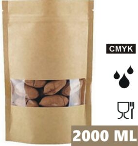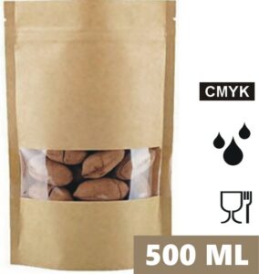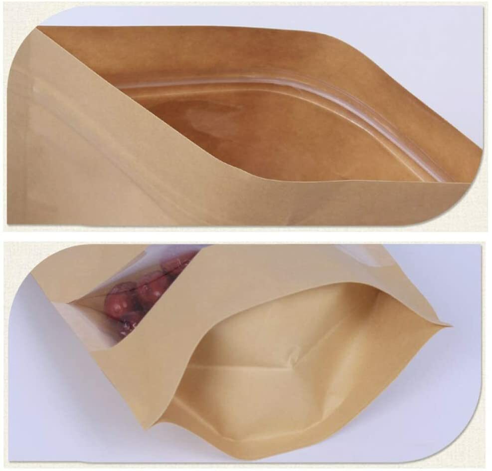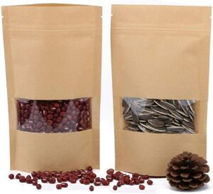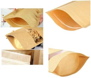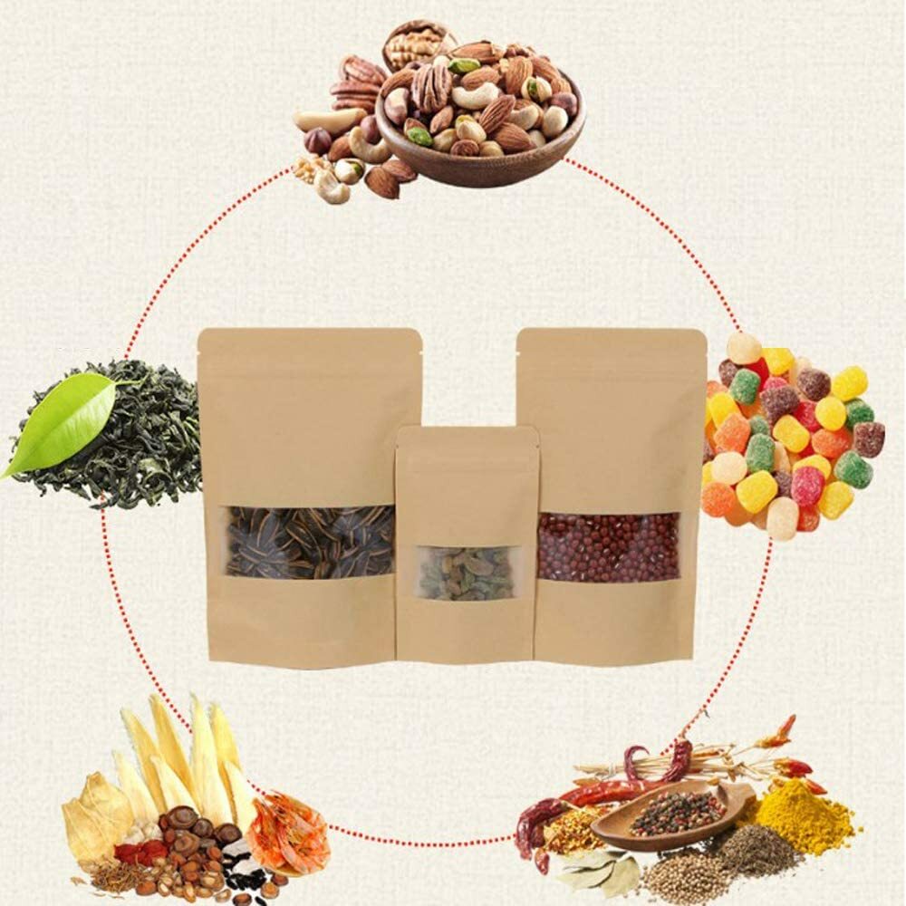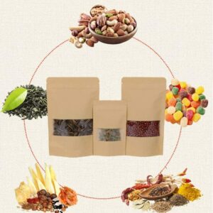 These kraft paper stand up pouches are designed for neat storage and professional-looking presentation of dry goods. The narrow window lets customers see the contents at a glance, while the stable base helps the bag stand upright on shelves, counters and display units.