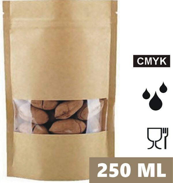 Resealable stand up kraft paper pouches with a narrow window for easy product visibility. Foil-lined inside helps protect contents from odours and moisture, making them ideal for storing and presenting dry foods and light loose items.