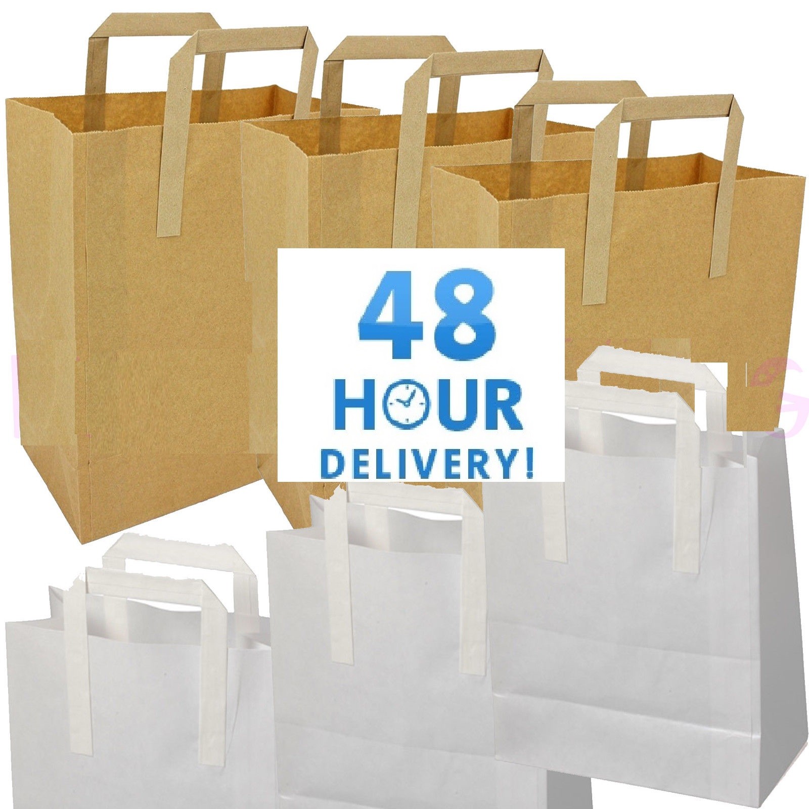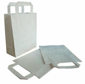 Strong kraft paper SOS carrier bags with tape handles for takeaways, packed lunches and party favours. The flat block bottom helps keep food boxes and containers upright, making them ideal for catering and retail use.