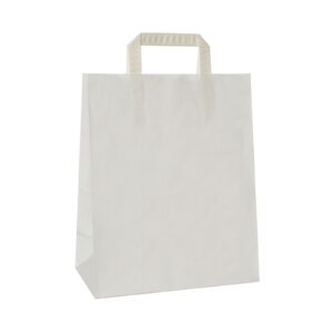 Made from kraft paper with strong external tape handles, the self-opening satchel design makes them quick and convenient to pack. The squared base allows the bag to stand upright, helping speed up service and reduce spills.