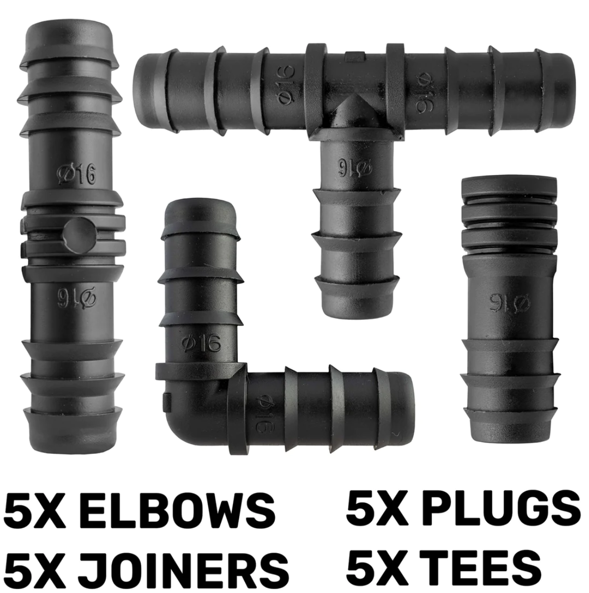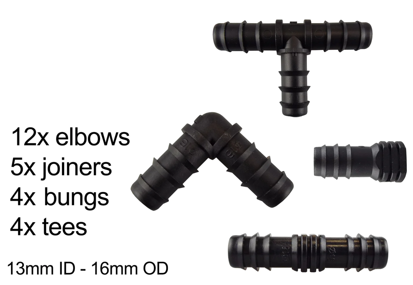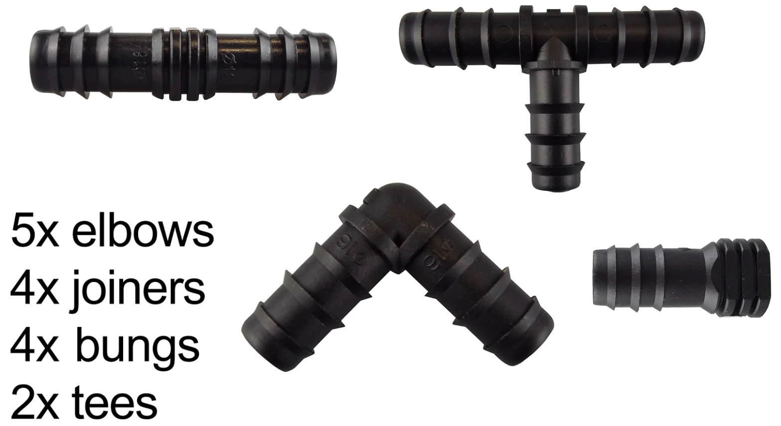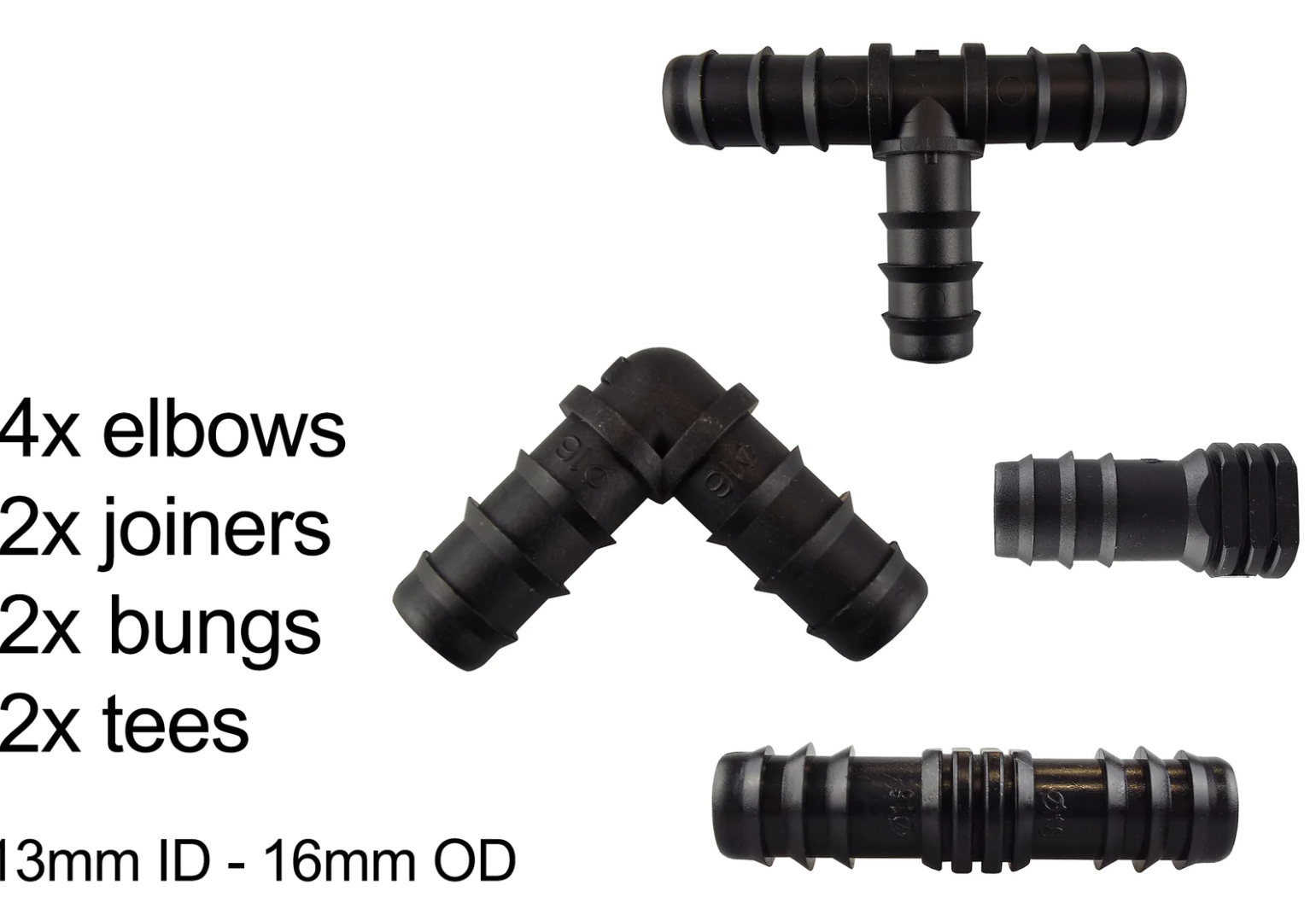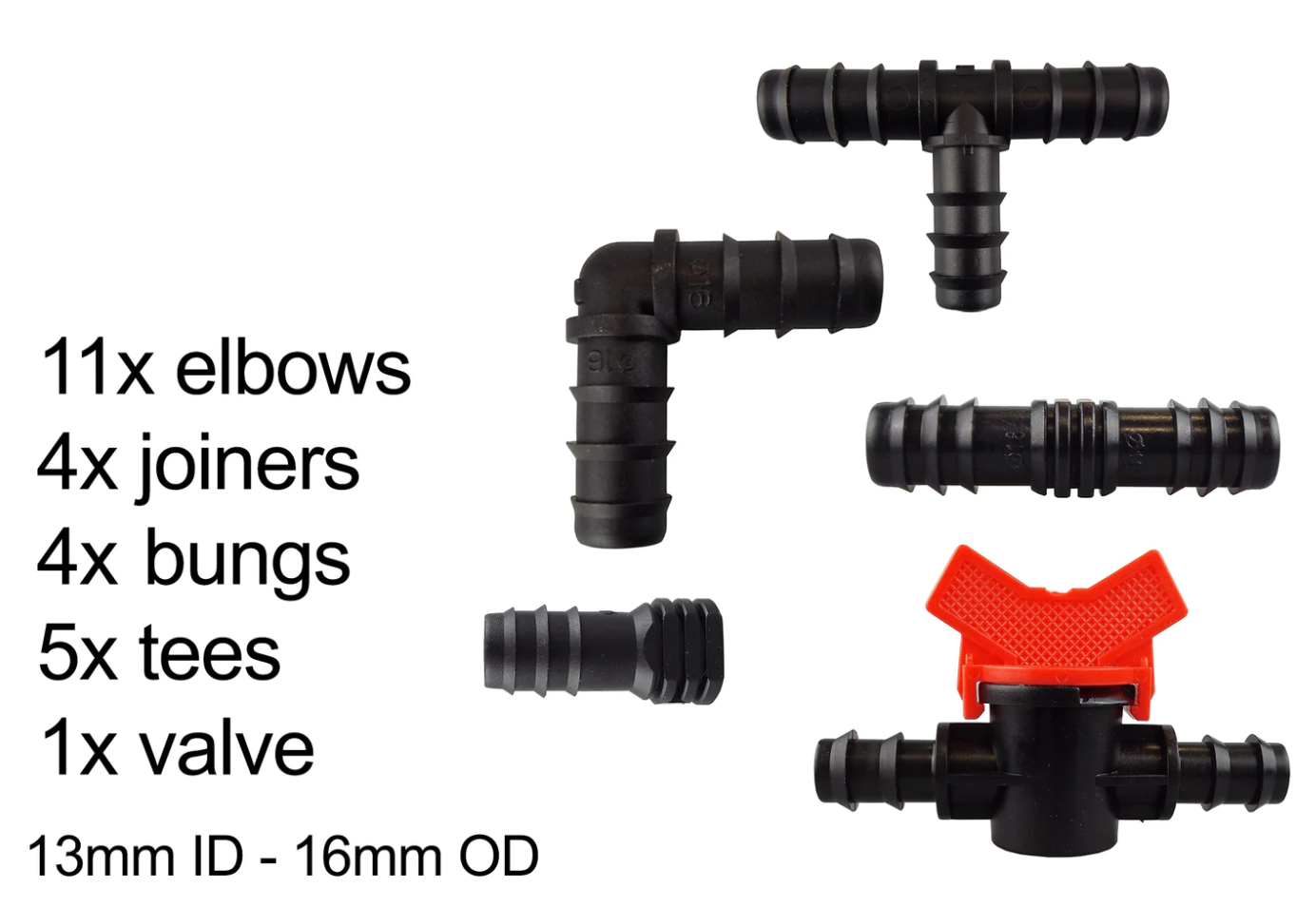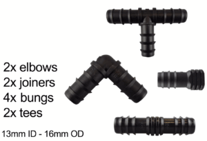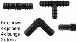 | Item | 1M – Hose sample, 7.5M + End Connectors, 15M + End Connectors, 20M + End Connectors, 25M + End Connectors, 30M + End Connectors, 50M – Hose only, 100M – Hose only, 200M – Hose only, 3 x In-Line Valve, 5 x Elbow Connectors, 5 x End plugs, 5 x Straight Connectors, 5 x Tee Connectors, 5 x Y Connectors, 10 x Pegs, 50 x Pegs, 100 x Pegs, Female hose connector, Porous hose adapter, Pressure reducer, Connector set 1, Connector set 2, Connector set 3, Connector set 4, Connector set 5, Connector set 6 |