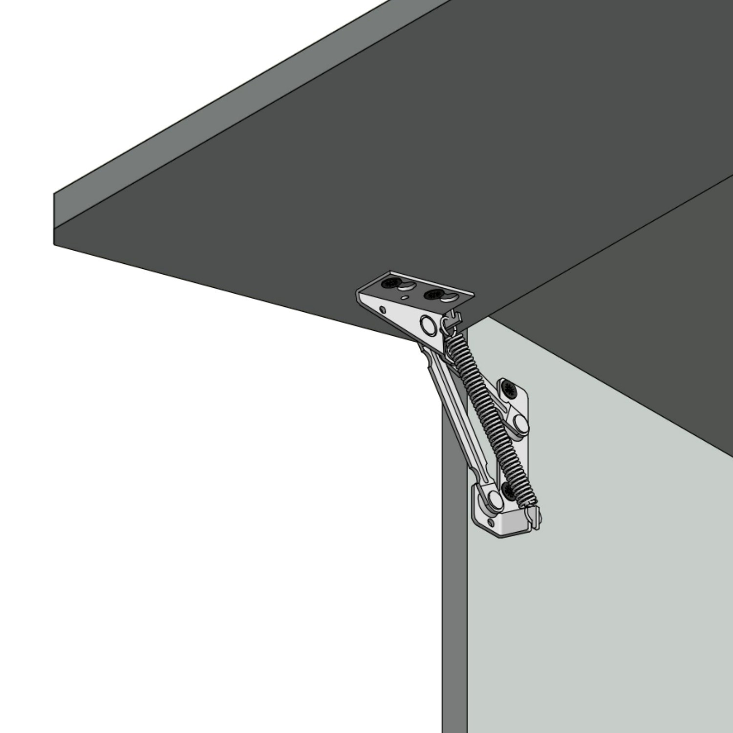 Spring-loaded lift-up hinge supports that hold cabinet lids and flap doors open at around 75° for easy access. Ideal for wall cupboards and furniture fronts, with a left and right support for stable, balanced lifting.