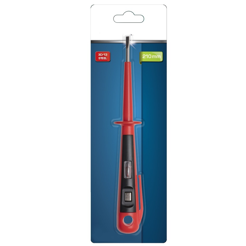 Designed in a screwdriver-style format, it features an insulated handle for safer handling and a built-in indicator lamp that illuminates when live voltage is detected. The slotted tip is shaped to help with access to common terminals and outlets.
