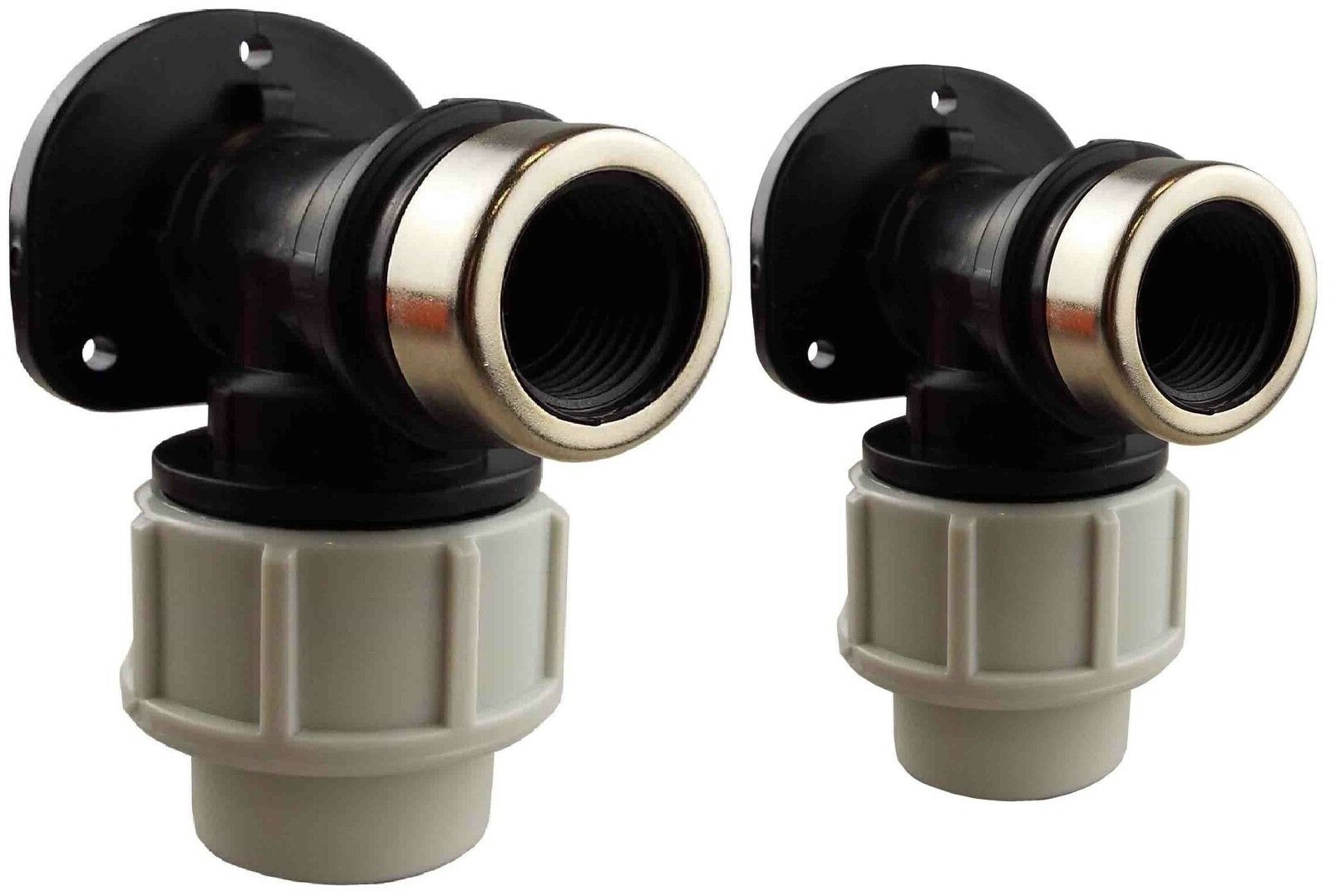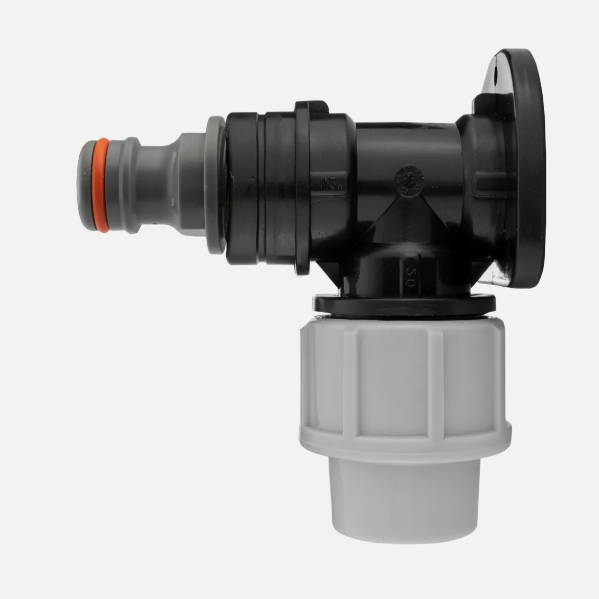 Wall plate elbow fitting for connecting MDPE pipe to an outside tap with a click lock hose connector. Demountable and reusable, it provides a secure, tidy connection when fixed to a post or brickwork. Suitable for cold mains supply only.