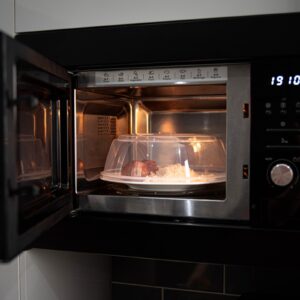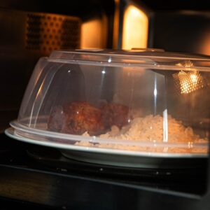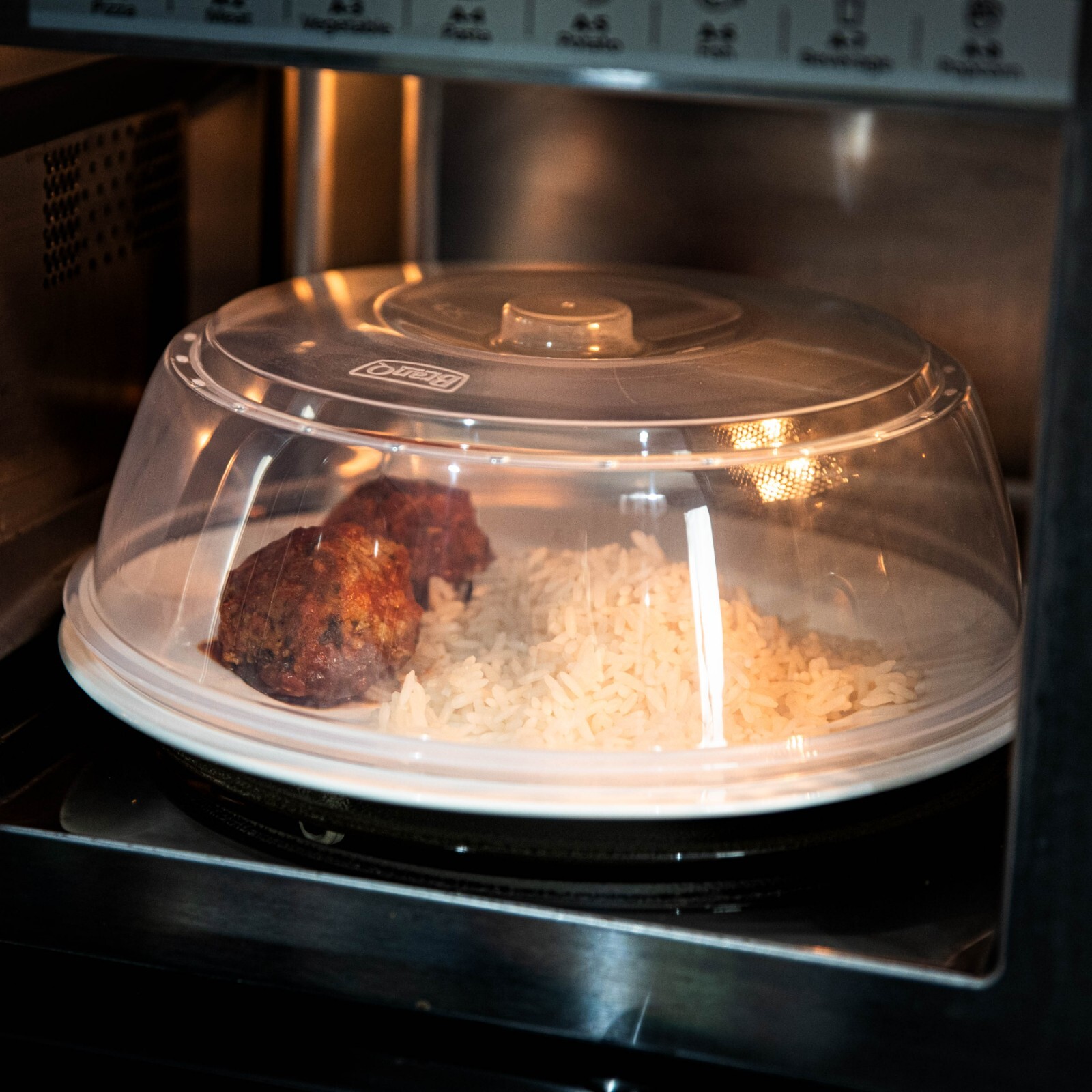 Use it to reheat meals, cover leftovers, or keep food warm for a short time after cooking. It’s a handy option for soups, sauces, pasta and other foods that commonly spit in the microwave.