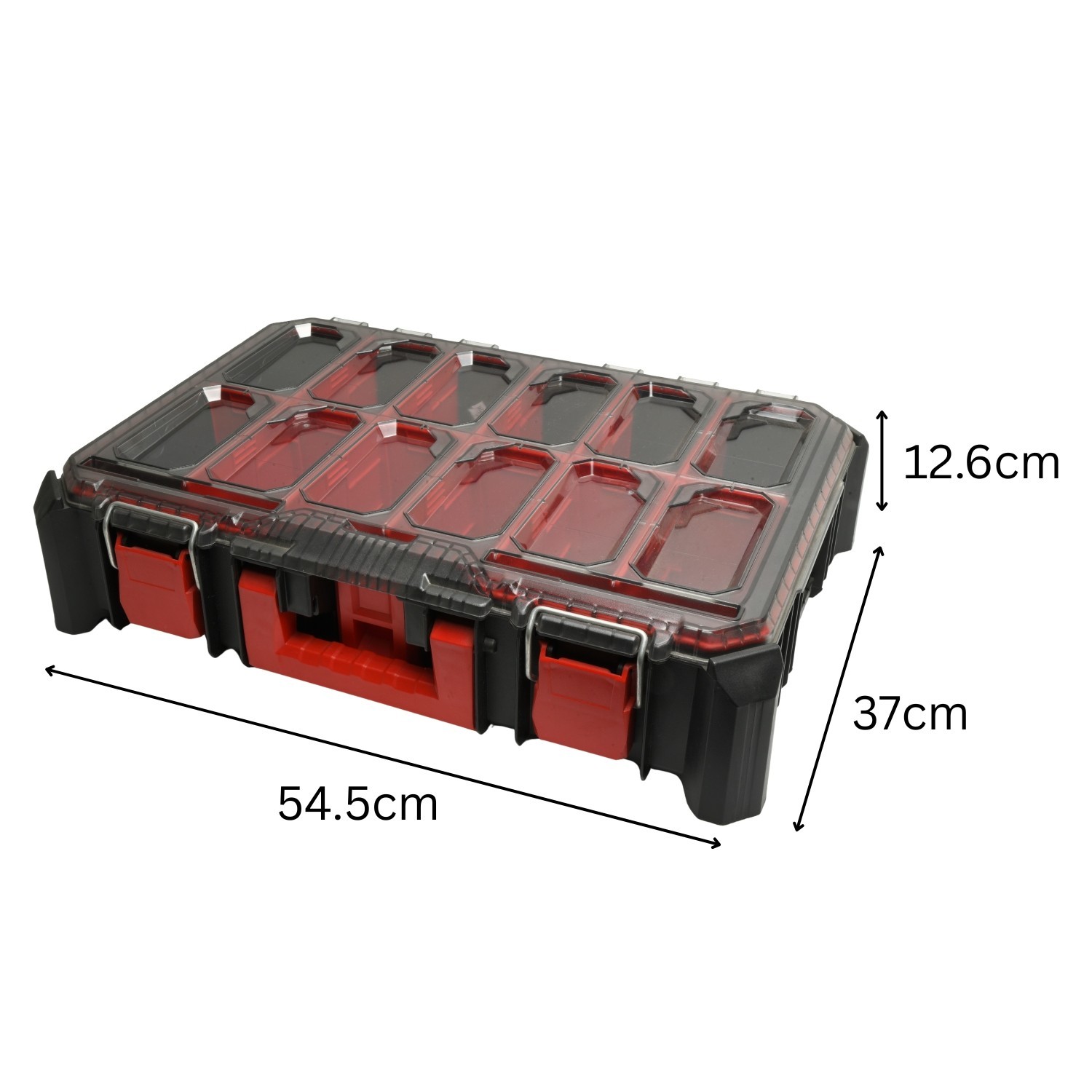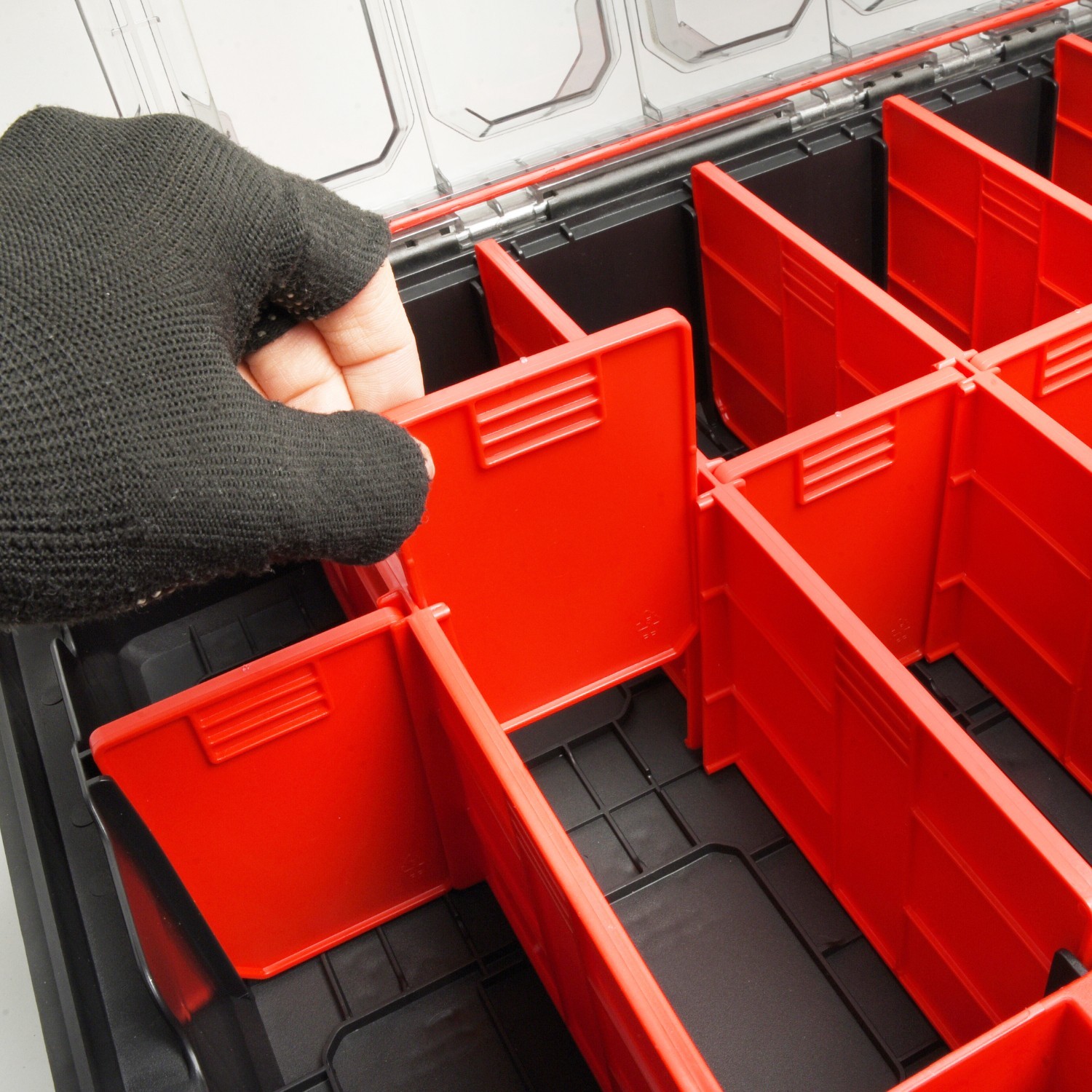 Keep tools, fixings and small parts organised in a tough modular storage case with removable dividers. The clear polycarbonate lid lets you see contents at a glance, while the stackable design and carry handle make it easy to transport between jobs.