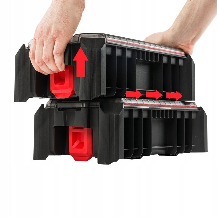 The modern rail connection system allows the organisers to link together with a click, creating a stable stack for transport and storage. A quick-access design lets you open connected organisers without needing to detach them, making it practical when working on-site.