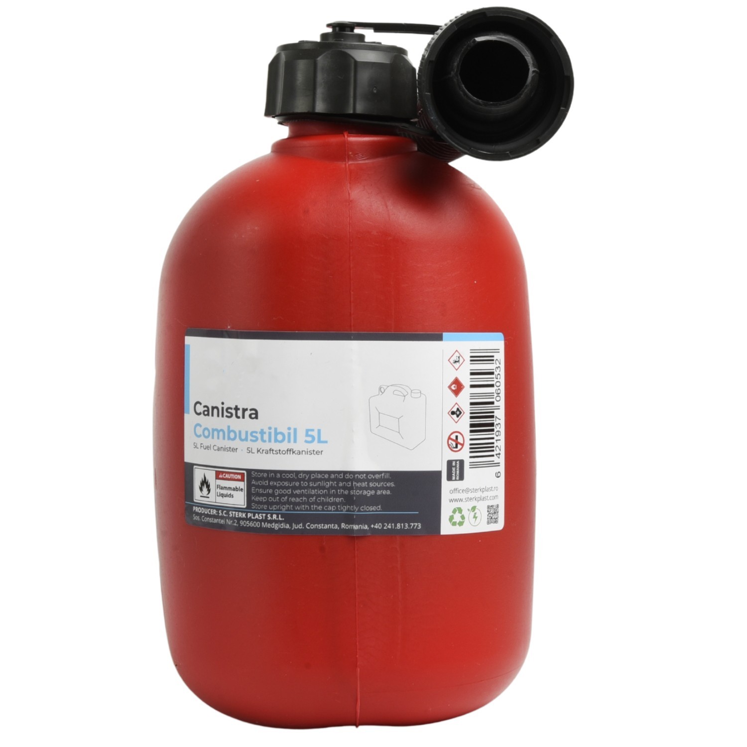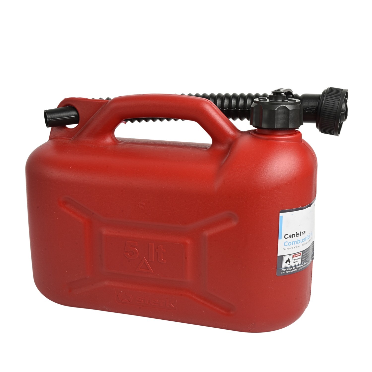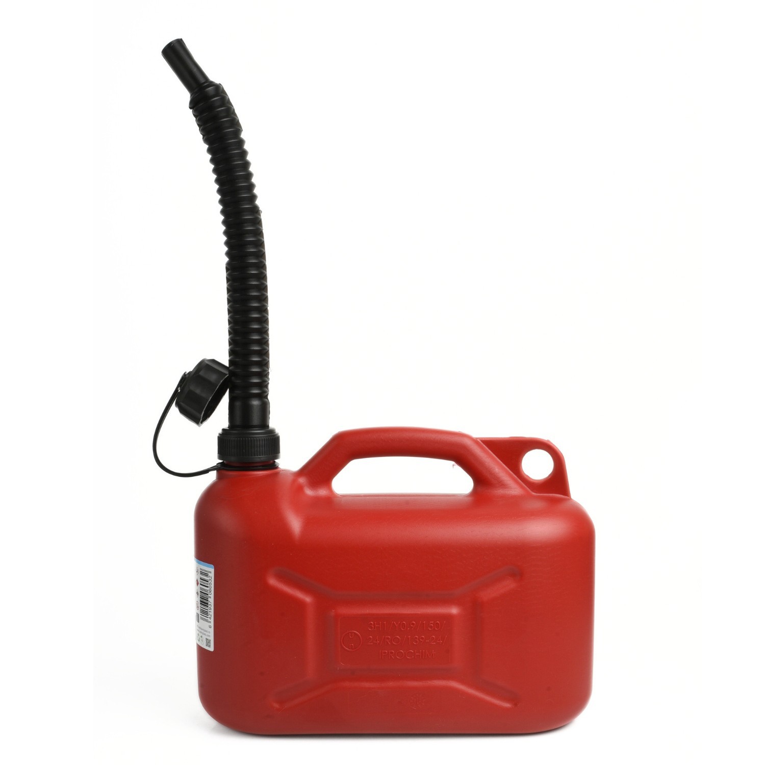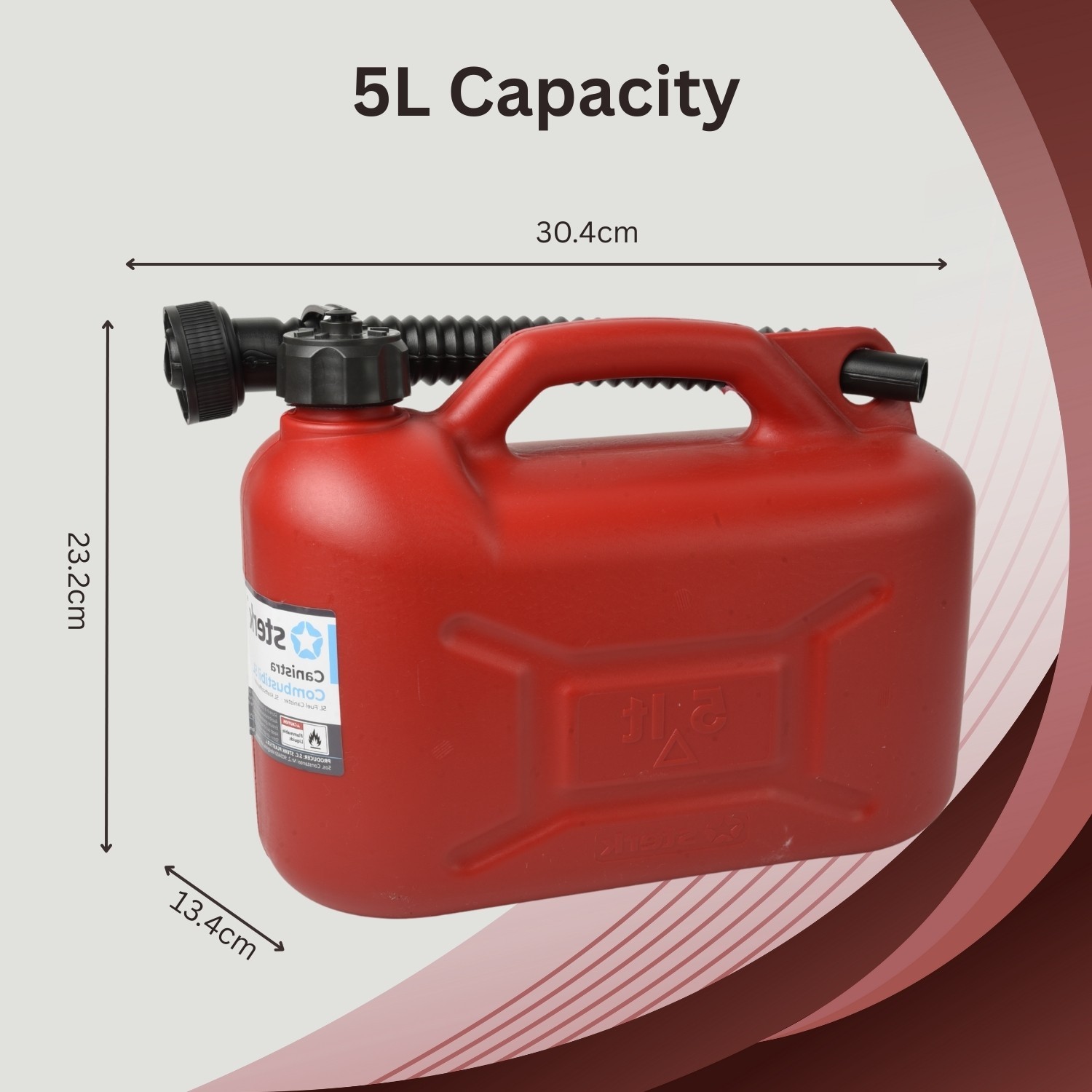 Compact 5L fuel can for safe storage and easy refuelling of petrol or diesel. Supplied with a flexible pouring spout and secure cap to help reduce splashes and leaks. Ideal for topping up lawn mowers, generators and other small engines.