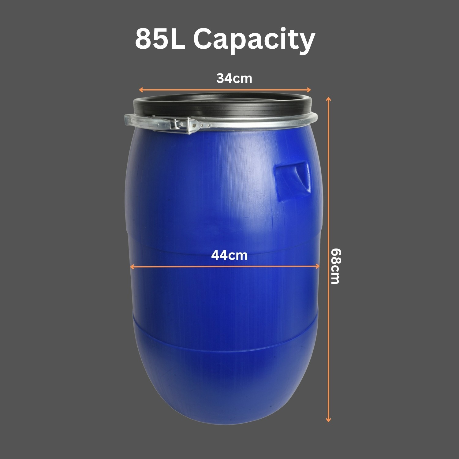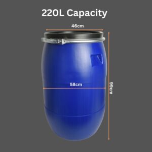 Made from food-safe high-density polyethylene (HDPE), the barrel is tough, reusable and easy to wash down. A removable lid is held firmly in place by a galvanised steel ring and lever-lock closure, helping create an airtight, tamper-resistant fit suitable for storage and transport.